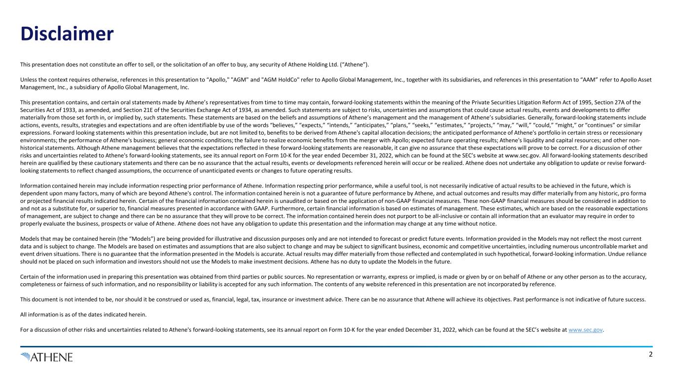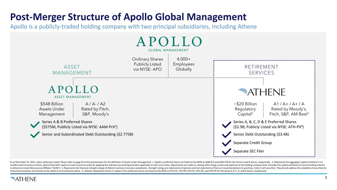 Disclaimer 2 This presentation does not constitute an offer to sell, or the solicitation of an offer to buy, any security of Athene Holding Ltd. (“Athene”). Unless the context requires otherwise, references in this presentation to “Apollo," "AGM" and "AGM HoldCo" refer to Apollo Global Management, Inc., together with its subsidiaries, and references in this presentation to “AAM” refer to Apollo Asset Management, Inc., a subsidiary of Apollo Global Management, Inc. This presentation contains, and certain oral statements made by Athene’s representatives from time to time may contain, forward-looking statements within the meaning of the Private Securities Litigation Reform Act of 1995, Section 27A of the Securities Act of 1933, as amended, and Section 21E of the Securities Exchange Act of 1934, as amended. Such statements are subject to risks, uncertainties and assumptions that could cause actual results, events and developments to differ materially from those set forth in, or implied by, such statements. These statements are based on the beliefs and assumptions of Athene’s management and the management of Athene’s subsidiaries. Generally, forward-looking statements include actions, events, results, strategies and expectations and are often identifiable by use of the words “believes,” “expects,” “intends,” “anticipates,” “plans,” “seeks,” “estimates,” “projects,” “may,” “will,” “could,” “might,” or “continues” or similar expressions. Forward looking statements within this presentation include, but are not limited to, benefits to be derived from Athene's capital allocation decisions; the anticipated performance of Athene's portfolio in certain stress or recessionary environments; the performance of Athene's business; general economic conditions; the failure to realize economic benefits from the merger with Apollo; expected future operating results; Athene's liquidity and capital resources; and other non- historical statements. Although Athene management believes that the expectations reflected in these forward-looking statements are reasonable, it can give no assurance that these expectations will prove to be correct. For a discussion of other risks and uncertainties related to Athene's forward-looking statements, see its annual report on Form 10-K for the year ended December 31, 2022, which can be found at the SEC’s website at www.sec.gov. All forward-looking statements described herein are qualified by these cautionary statements and there can be no assurance that the actual results, events or developments referenced herein will occur or be realized. Athene does not undertake any obligation to update or revise forward- looking statements to reflect changed assumptions, the occurrence of unanticipated events or changes to future operating results. Information contained herein may include information respecting prior performance of Athene. Information respecting prior performance, while a useful tool, is not necessarily indicative of actual results to be achieved in the future, which is dependent upon many factors, many of which are beyond Athene's control. The information contained herein is not a guarantee of future performance by Athene, and actual outcomes and results may differ materially from any historic, pro forma or projected financial results indicated herein. Certain of the financial information contained herein is unaudited or based on the application of non-GAAP financial measures. These non-GAAP financial measures should be considered in addition to and not as a substitute for, or superior to, financial measures presented in accordance with GAAP. Furthermore, certain financial information is based on estimates of management. These estimates, which are based on the reasonable expectations of management, are subject to change and there can be no assurance that they will prove to be correct. The information contained herein does not purport to be all-inclusive or contain all information that an evaluator may require in order to properly evaluate the business, prospects or value of Athene. Athene does not have any obligation to update this presentation and the information may change at any time without notice. Models that may be contained herein (the “Models”) are being provided for illustrative and discussion purposes only and are not intended to forecast or predict future events. Information provided in the Models may not reflect the most current data and is subject to change. The Models are based on estimates and assumptions that are also subject to change and may be subject to significant business, economic and competitive uncertainties, including numerous uncontrollable market and event driven situations. There is no guarantee that the information presented in the Models is accurate. Actual results may differ materially from those reflected and contemplated in such hypothetical, forward-looking information. Undue reliance should not be placed on such information and investors should not use the Models to make investment decisions. Athene has no duty to update the Models in the future. Certain of the information used in preparing this presentation was obtained from third parties or public sources. No representation or warranty, express or implied, is made or given by or on behalf of Athene or any other person as to the accuracy, completeness or fairness of such information, and no responsibility or liability is accepted for any such information. The contents of any website referenced in this presentation are not incorporated by reference. This document is not intended to be, nor should it be construed or used as, financial, legal, tax, insurance or investment advice. There can be no assurance that Athene will achieve its objectives. Past performance is not indicative of future success. All information is as of the dates indicated herein. For a discussion of other risks and uncertainties related to Athene'
