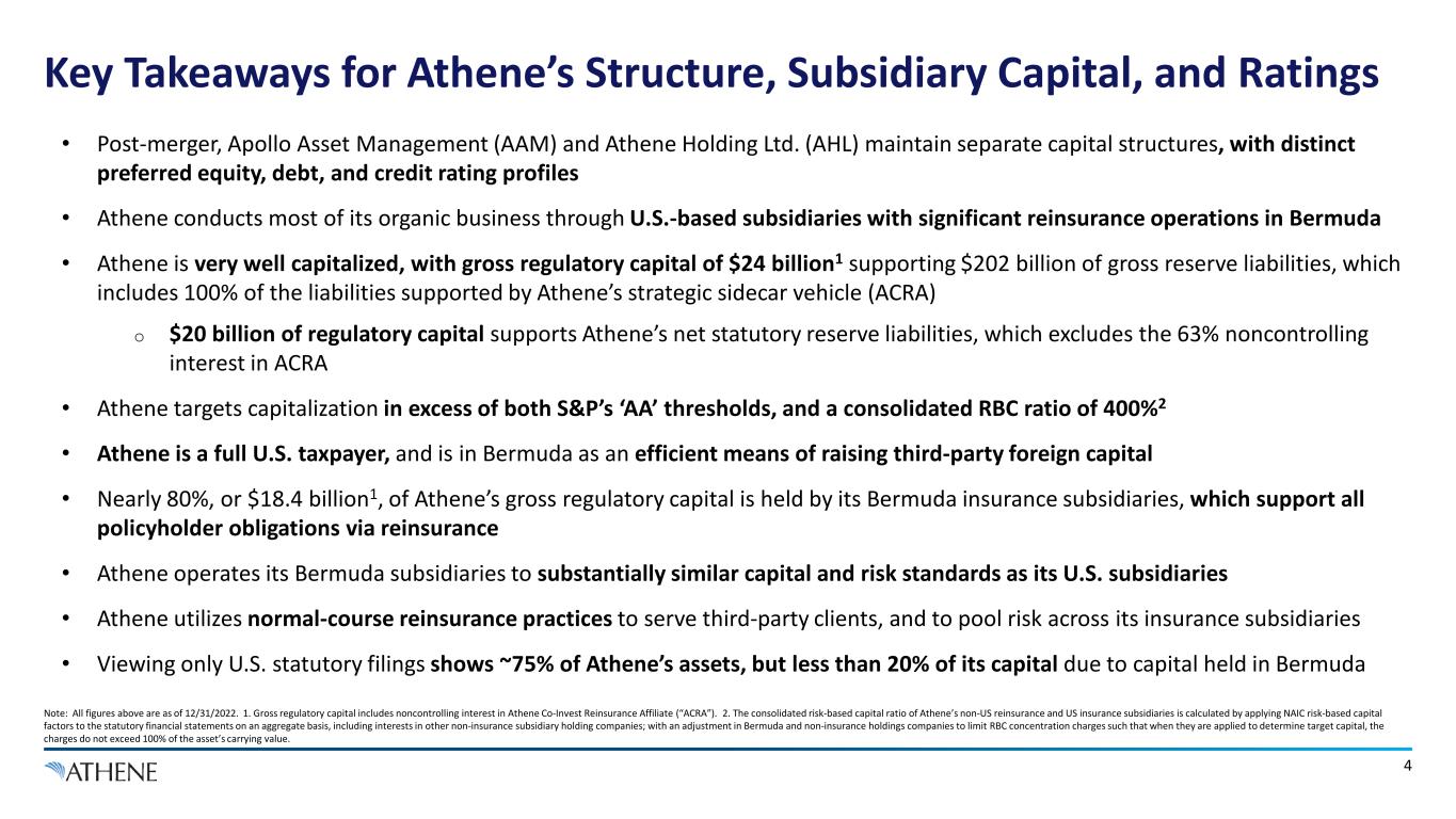 3 Post-Merger Structure of Apollo Global Management As of December 31, 2022, unless otherwise noted. Please refer to page 30 of this presentation for the definition of Assets Under Management. 1. Apollo’s preferred shares are listed on the NYSE as AAM PrA and AAM PrB for the Series A and B shares, respectively. 2. Represents the aggregate capital of Athene’s U.S. and Bermuda insurance entities, determined with respect to each insurance entity by applying the statutory accounting principles applicable to each such entity. Adjustments are made to, among other things, assets and expenses at the holding company level. Excludes the capital attributed to noncontrolling interest in Athene Co-Invest Reinsurance Affiliate (“ACRA”). 3. Represents the financial strength ratings of Athene’s primary insurance subsidiaries. Strength ratings are statements of opinions and not statements of facts or recommendations to purchase, hold or sell securities. They do not address the suitability of securities for investment purposes and should not be relied on as investment advice. 4. Athene’s depositary shares in respect of its preferred shares are listed on the NYSE as ATH-PA, ATH-PB, ATH-PC, ATH-PD, and ATH-PE for the series A, B, C, D, and E shares, respectively. $548 Billion Assets Under Management ~$20 Billion Regulatory Capital2 A1 / A+ / A+ / A Rated by Moody’s, Fitch, S&P, AM Best3 ASSET MANAGEMENT RETIREMENT SERVICES Ordinary Shares Publicly Listed via NYSE: APO 4,000+ Employees Globally ASSET MANAGEMENT GLOBAL MANAGEMENT A / A- / A2 Rated by Fitch, S&P, Moody’s Apollo is a publicly-traded holding company with two principal subsidiaries, including Athene Senior Debt Outstanding ($3.4B) Series A, B, C, D & E Preferred Shares ($2.9B, Publicly Listed via NYSE: ATH-PX4) Separate Credit Group Separate SEC Filer Senior and Subordinated Debt Outstanding ($2.775B) Series A & B Preferred Shares ($575M, Publicly Listed via NYSE: AAM-PrX1)