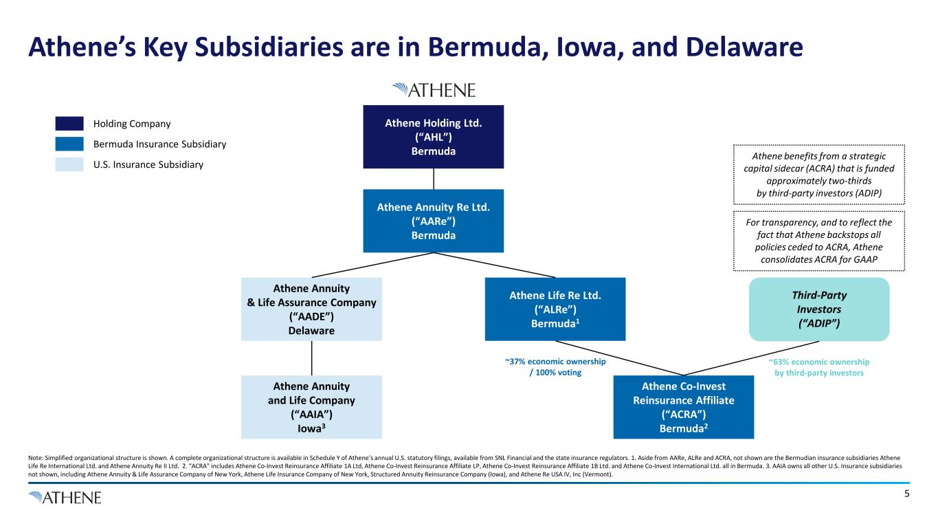 4 Key Takeaways for Athene’s Structure, Subsidiary Capital, and Ratings Note: All figures above are as of 12/31/2022. 1. Gross regulatory capital includes noncontrolling interest in Athene Co-Invest Reinsurance Affiliate (“ACRA”). 2. The consolidated risk-based capital ratio of Athene’s non-US reinsurance and US insurance subsidiaries is calculated by applying NAIC risk-based capital factors to the statutory financial statements on an aggregate basis, including interests in other non-insurance subsidiary holding companies; with an adjustment in Bermuda and non-insurance holdings companies to limit RBC concentration charges such that when they are applied to determine target capital, the charges do not exceed 100% of the asset’s carrying value. • Post-merger, Apollo Asset Management (AAM) and Athene Holding Ltd. (AHL) maintain separate capital structures, with distinct preferred equity, debt, and credit rating profiles • Athene conducts most of its organic business through U.S.-based subsidiaries with significant reinsurance operations in Bermuda • Athene is very well capitalized, with gross regulatory capital of $24 billion1 supporting $202 billion of gross reserve liabilities, which includes 100% of the liabilities supported by Athene’s strategic sidecar vehicle (ACRA) o $20 billion of regulatory capital supports Athene’s net statutory reserve liabilities, which excludes the 63% noncontrolling interest in ACRA • Athene targets capitalization in excess of both S&P’s ‘AA’ thresholds, and a consolidated RBC ratio of 400%2 • Athene is a full U.S. taxpayer, and is in Bermuda as an efficient means of raising third-party foreign capital • Nearly 80%, or $18.4 billion1, of Athene’s gross regulatory capital is held by its Bermuda insurance subsidiaries, which support all policyholder obligations via reinsurance • Athene operates its Bermuda subsidiaries to substantially similar capital and risk standards as its U.S. subsidiaries • Athene utilizes normal-course reinsurance practices to serve third-party clients, and to pool risk across its insurance subsidiaries • Viewing only U.S. statutory filings shows ~75% of Athene’s assets, but less than 20% of its capital due to capital held in Bermuda