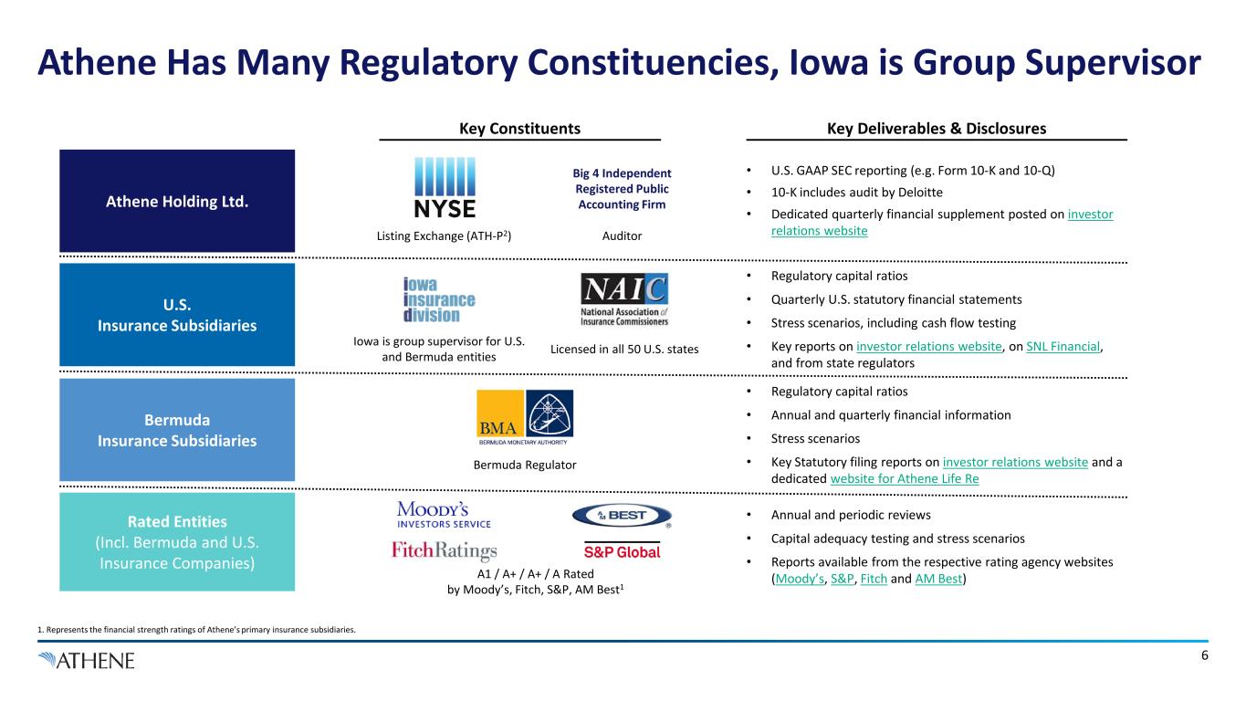 Third-Party Investors (“ADIP”) 5 Athene’s Key Subsidiaries are in Bermuda, Iowa, and Delaware Note: Simplified organizational structure is shown. A complete organizational structure is available in Schedule Y of Athene’s annual U.S. statutory filings, available from SNL Financial and the state insurance regulators. 1. Aside from AARe, ALRe and ACRA, not shown are the Bermudian insurance subsidiaries Athene Life Re International Ltd. and Athene Annuity Re II Ltd. 2. “ACRA” includes Athene Co-Invest Reinsurance Affiliate 1A Ltd, Athene Co-Invest Reinsurance Affiliate LP, Athene Co-Invest Reinsurance Affiliate 1B Ltd. and Athene Co-Invest International Ltd. all in Bermuda. 3. AAIA owns all other U.S. Insurance subsidiaries not shown, including Athene Annuity & Life Assurance Company of New York, Athene Life Insurance Company of New York, Structured Annuity Reinsurance Company (Iowa), and Athene Re USA IV, Inc (Vermont). Athene Annuity & Life Assurance Company (“AADE”) Delaware Athene Annuity Re Ltd. (“AARe”) Bermuda Athene Holding Ltd. (“AHL”) Bermuda Athene Co-Invest Reinsurance Affiliate (“ACRA”) Bermuda2 Athene Annuity and Life Company (“AAIA”) Iowa3 ~37% economic ownership / 100% voting For transparency, and to reflect the fact that Athene backstops all policies ceded to ACRA, Athene consolidates ACRA for GAAP Holding Company Bermuda Insurance Subsidiary U.S. Insurance Subsidiary Athene Life Re Ltd. (“ALRe”) Bermuda1 ~63% economic ownership by third-party investors Athene benefits from a strategic capital sidecar (ACRA) that is funded approximately two-thirds by third-party investors (ADIP)