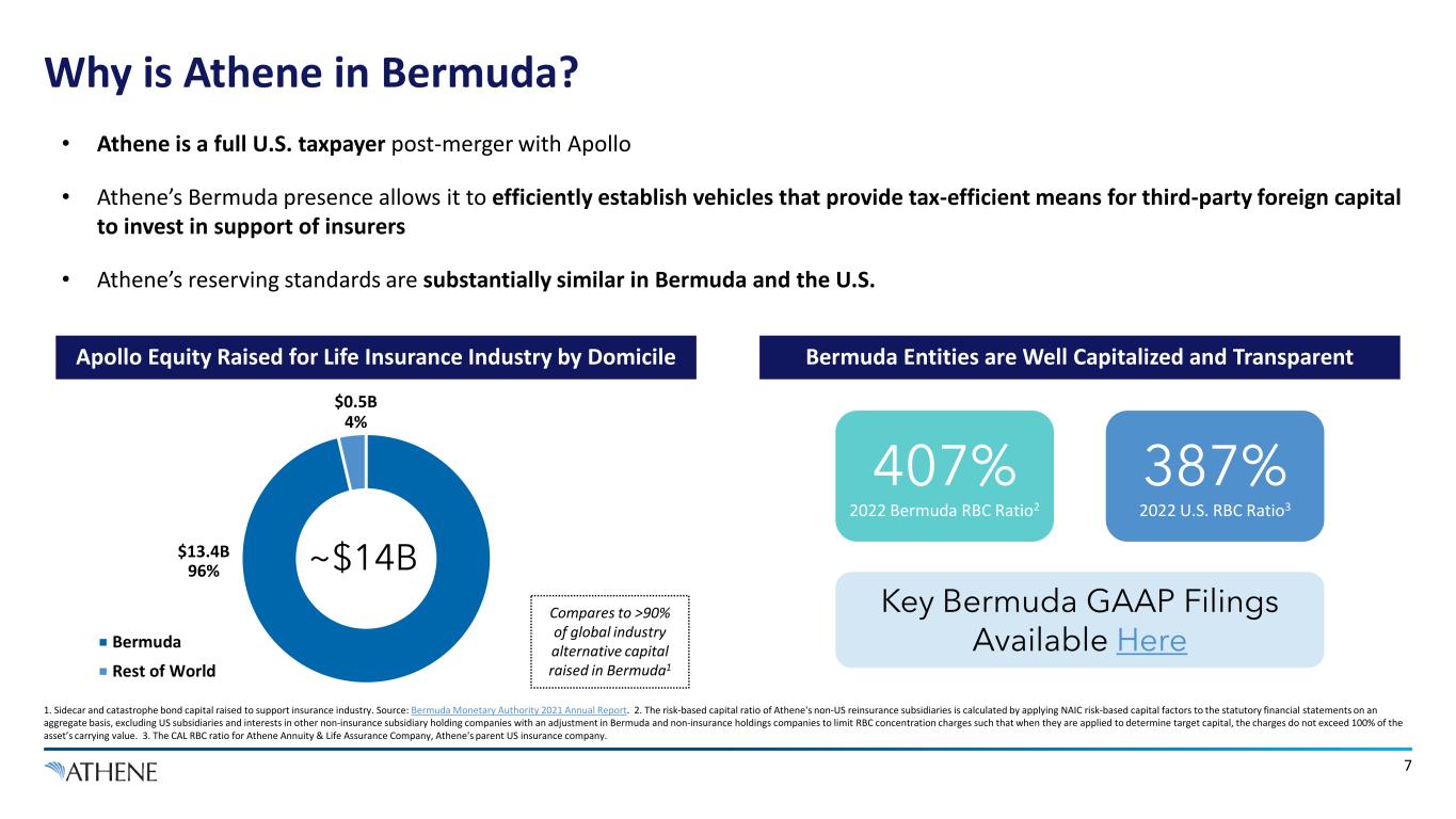 6 Athene Has Many Regulatory Constituencies, Iowa is Group Supervisor 1. Represents the financial strength ratings of Athene’s primary insurance subsidiaries. • U.S. GAAP SEC reporting (e.g. Form 10-K and 10-Q) • 10-K includes audit by Deloitte • Dedicated quarterly financial supplement posted on investor relations website Bermuda Insurance Subsidiaries U.S. Insurance Subsidiaries Athene Holding Ltd. Key Constituents Key Deliverables & Disclosures Bermuda Regulator Rated Entities (Incl. Bermuda and U.S. Insurance Companies) • Regulatory capital ratios • Annual and quarterly financial information • Stress scenarios • Key Statutory filing reports on investor relations website and a dedicated website for Athene Life Re • Regulatory capital ratios • Quarterly U.S. statutory financial statements • Stress scenarios, including cash flow testing • Key reports on investor relations website, on SNL Financial, and from state regulators • Annual and periodic reviews • Capital adequacy testing and stress scenarios • Reports available from the respective rating agency websites (Moody’s, S&P, Fitch and AM Best) Listing Exchange (ATH-P2) Auditor Big 4 Independent Registered Public Accounting Firm A1 / A+ / A+ / A Rated by Moody’s, Fitch, S&P, AM Best1 Licensed in all 50 U.S. statesIowa is group supervisor for U.S. and Bermuda entities