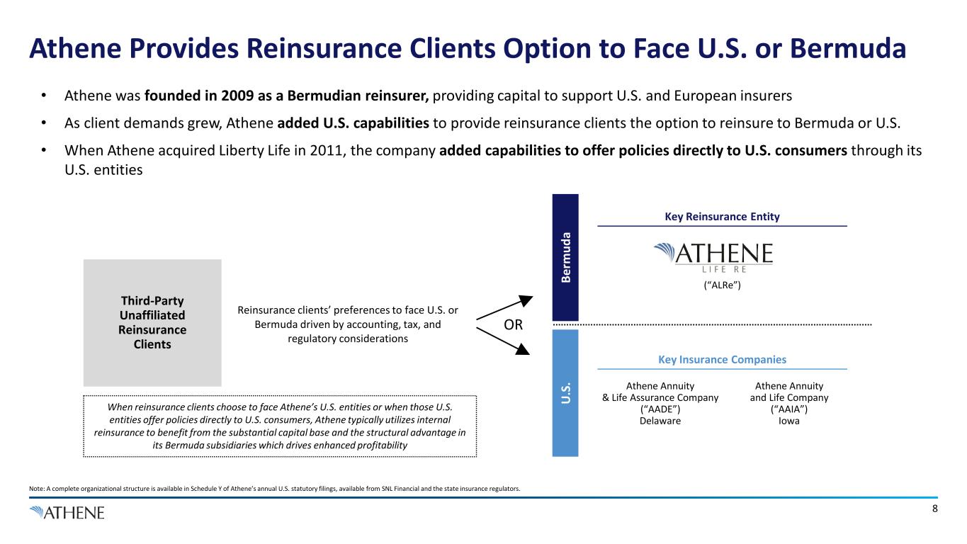 7 Why is Athene in Bermuda? • Athene is a full U.S. taxpayer post-merger with Apollo • Athene’s Bermuda presence allows it to efficiently establish vehicles that provide tax-efficient means for third-party foreign capital to invest in support of insurers • Athene’s reserving standards are substantially similar in Bermuda and the U.S. Apollo Equity Raised for Life Insurance Industry by Domicile Bermuda Entities are Well Capitalized and Transparent Bermuda Rest of World ~$14B 4% 96% Compares to >90% of global industry alternative capital raised in Bermuda1 407% 2022 Bermuda RBC Ratio2 387% 2022 U.S. RBC Ratio3 1. Sidecar and catastrophe bond capital raised to support insurance industry. Source: Bermuda Monetary Authority 2021 Annual Report. 2. The risk-based capital ratio of Athene's non-US reinsurance subsidiaries is calculated by applying NAIC risk-based capital factors to the statutory financial statements on an aggregate basis, excluding US subsidiaries and interests in other non-insurance subsidiary holding companies with an adjustment in Bermuda and non-insurance holdings companies to limit RBC concentration charges such that when they are applied to determine target capital, the charges do not exceed 100% of the asset’s carrying value. 3. The CAL RBC ratio for Athene Annuity & Life Assurance Company, Athene's parent US insurance company. Key Bermuda GAAP Filings Available Here $13.4B $0.5B