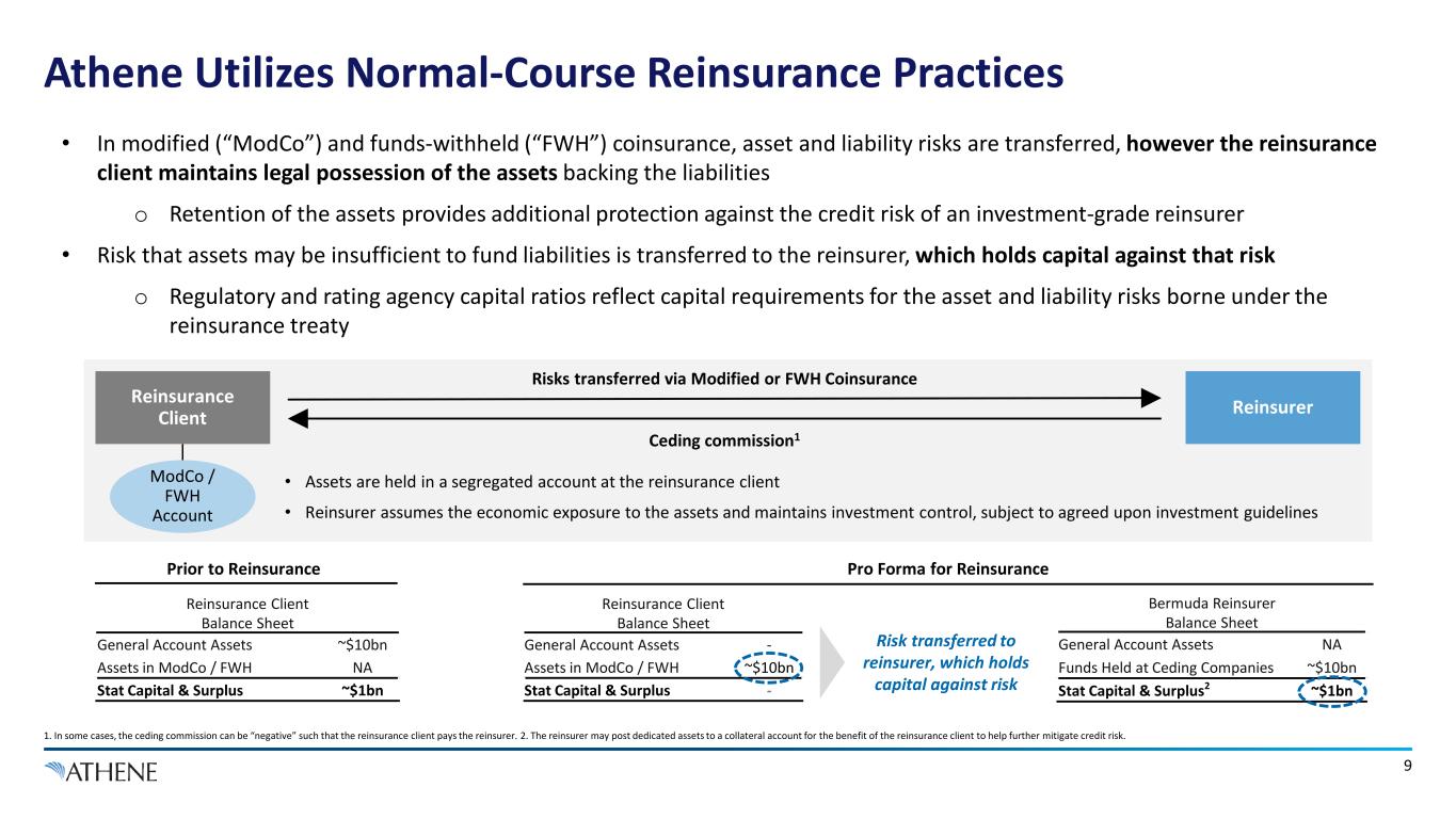 8 Athene Provides Reinsurance Clients Option to Face U.S. or Bermuda Note: A complete organizational structure is available in Schedule Y of Athene’s annual U.S. statutory filings, available from SNL Financial and the state insurance regulators. When reinsurance clients choose to face Athene’s U.S. entities or when those U.S. entities offer policies directly to U.S. consumers, Athene typically utilizes internal reinsurance to benefit from the substantial capital base and the structural advantage in its Bermuda subsidiaries which drives enhanced profitability Third-Party Unaffiliated Reinsurance Clients Reinsurance clients’ preferences to face U.S. or Bermuda driven by accounting, tax, and regulatory considerations Key Reinsurance Entity (“ALRe”) Athene Annuity and Life Company (“AAIA”) Iowa Athene Annuity & Life Assurance Company (“AADE”) Delaware Key Insurance Companies Be rm ud a U .S . OR • Athene was founded in 2009 as a Bermudian reinsurer, providing capital to support U.S. and European insurers • As client demands grew, Athene added U.S. capabilities to provide reinsurance clients the option to reinsure to Bermuda or U.S. • When Athene acquired Liberty Life in 2011, the company added capabilities to offer policies directly to U.S. consumers through its U.S. entities