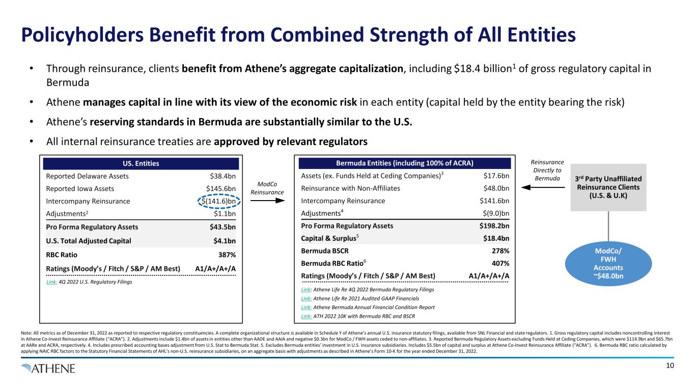 9 Athene Utilizes Normal-Course Reinsurance Practices 1. In some cases, the ceding commission can be “negative” such that the reinsurance client pays the reinsurer. 2. The reinsurer may post dedicated assets to a collateral account for the benefit of the reinsurance client to help further mitigate credit risk. Reinsurance Client Balance Sheet General Account Assets - Assets in ModCo / FWH ~$10bn Stat Capital & Surplus - Reinsurance Client Balance Sheet General Account Assets ~$10bn Assets in ModCo / FWH NA Stat Capital & Surplus ~$1bn Bermuda Reinsurer Balance Sheet General Account Assets NA Funds Held at Ceding Companies ~$10bn Stat Capital & Surplus2 ~$1bn Reinsurer Risks transferred via Modified or FWH Coinsurance Reinsurance Client Ceding commission1 • Assets are held in a segregated account at the reinsurance client • Reinsurer assumes the economic exposure to the assets and maintains investment control, subject to agreed upon investment guidelines ModCo / FWH Account Risk transferred to reinsurer, which holds capital against risk Prior to Reinsurance Pro Forma for Reinsurance • In modified (“ModCo”) and funds-withheld (“FWH”) coinsurance, asset and liability risks are transferred, however the reinsurance client maintains legal possession of the assets backing the liabilities o Retention of the assets provides additional protection against the credit risk of an investment-grade reinsurer • Risk that assets may be insufficient to fund liabilities is transferred to the reinsurer, which holds capital against that risk o Regulatory and rating agency capital ratios reflect capital requirements for the asset and liability risks borne under the reinsurance treaty
