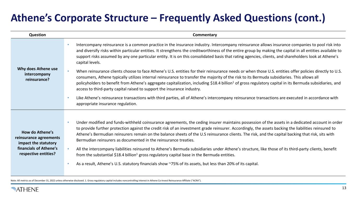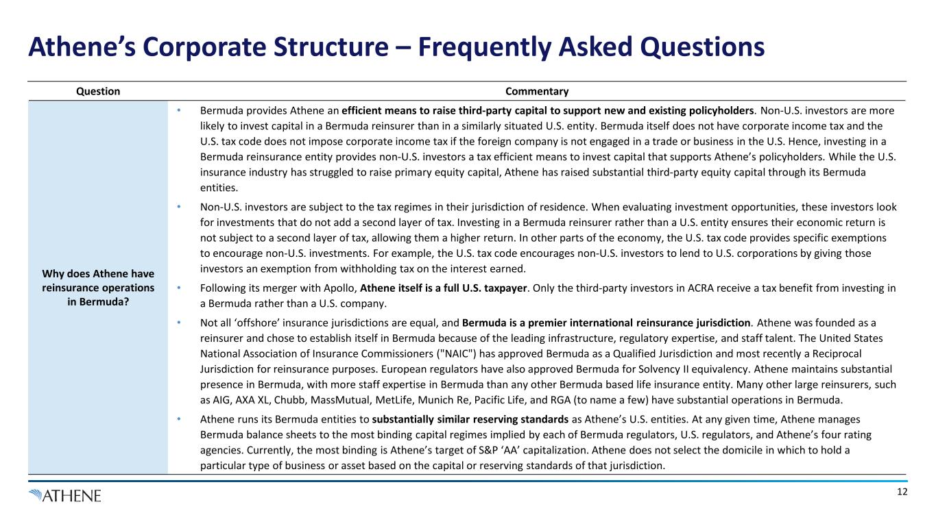 12 Athene’s Corporate Structure – Frequently Asked Questions Question Commentary Why does Athene have reinsurance operations in Bermuda? • Bermuda provides Athene an efficient means to raise third-party capital to support new and existing policyholders. Non-U.S. investors are more likely to invest capital in a Bermuda reinsurer than in a similarly situated U.S. entity. Bermuda itself does not have corporate income tax and the U.S. tax code does not impose corporate income tax if the foreign company is not engaged in a trade or business in the U.S. Hence, investing in a Bermuda reinsurance entity provides non-U.S. investors a tax efficient means to invest capital that supports Athene’s policyholders. While the U.S. insurance industry has struggled to raise primary equity capital, Athene has raised substantial third-party equity capital through its Bermuda entities. • Non-U.S. investors are subject to the tax regimes in their jurisdiction of residence. When evaluating investment opportunities, these investors look for investments that do not add a second layer of tax. Investing in a Bermuda reinsurer rather than a U.S. entity ensures their economic return is not subject to a second layer of tax, allowing them a higher return. In other parts of the economy, the U.S. tax code provides specific exemptions to encourage non-U.S. investments. For example, the U.S. tax code encourages non-U.S. investors to lend to U.S. corporations by giving those investors an exemption from withholding tax on the interest earned. • Following its merger with Apollo, Athene itself is a full U.S. taxpayer. Only the third-party investors in ACRA receive a tax benefit from investing in a Bermuda rather than a U.S. company. • Not all ‘offshore’ insurance jurisdictions are equal, and Bermuda is a premier international reinsurance jurisdiction. Athene was founded as a reinsurer and chose to establish itself in Bermuda because of the leading infrastructure, regulatory expertise, and staff talent. The United States National Association of Insurance Commissioners ("NAIC") has approved Bermuda as a Qualified Jurisdiction and most recently a Reciprocal Jurisdiction for reinsurance purposes. European regulators have also approved Bermuda for Solvency II equivalency. Athene maintains substantial presence in Bermuda, with more staff expertise in Bermuda than any other Bermuda based life insurance entity. Many other large reinsurers, such as AIG, AXA XL, Chubb, MassMutual, MetLife, Munich Re, Pacific Life, and RGA (to name a few) have substantial operations in Bermuda. • Athene runs its Bermuda entities to substantially similar reserving standards as Athene’s U.S. entities. At any given time, Athene manages Bermuda balance sheets to the most binding capital regimes implied by each of Bermuda regulators, U.S. regulators, and Athene’s four rating agencies. Currently, the most binding is Athene’s target of S&P ‘AA’ capitalization. Athene does not select the domicile in which to hold a particular type of business or asset based on the capital or reserving standards of that jurisdiction.