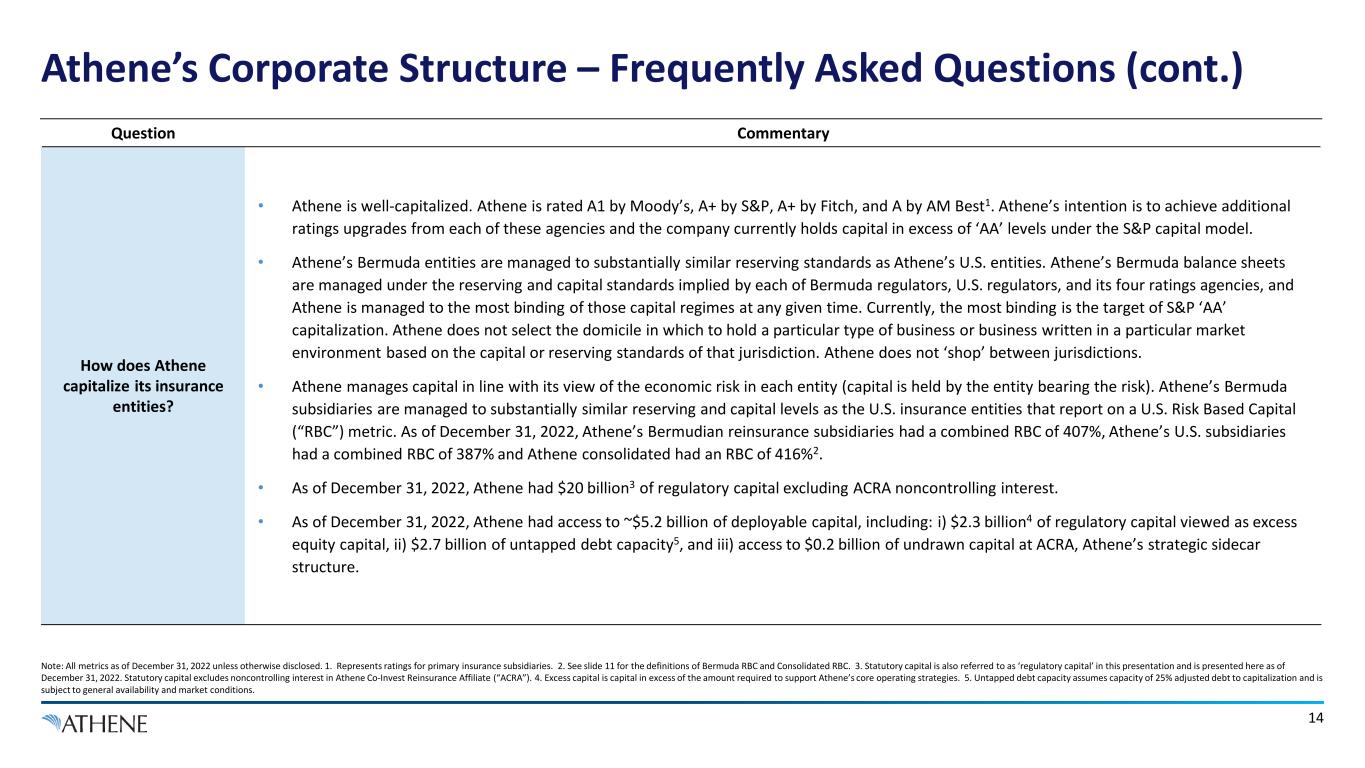13 Athene’s Corporate Structure – Frequently Asked Questions (cont.) Note: All metrics as of December 31, 2022 unless otherwise disclosed. 1. Gross regulatory capital includes noncontrolling interest in Athene Co-Invest Reinsurance Affiliate (“ACRA”). Question Commentary Why does Athene use intercompany reinsurance? • Intercompany reinsurance is a common practice in the insurance industry. Intercompany reinsurance allows insurance companies to pool risk into and diversify risks within particular entities. It strengthens the creditworthiness of the entire group by making the capital in all entities available to support risks assumed by any one particular entity. It is on this consolidated basis that rating agencies, clients, and shareholders look at Athene’s capital levels. • When reinsurance clients choose to face Athene’s U.S. entities for their reinsurance needs or when those U.S. entities offer policies directly to U.S. consumers, Athene typically utilizes internal reinsurance to transfer the majority of the risk to its Bermuda subsidiaries. This allows all policyholders to benefit from Athene’s aggregate capitalization, including $18.4 billion1 of gross regulatory capital in its Bermuda subsidiaries, and access to third-party capital raised to support the insurance industry. • Like Athene’s reinsurance transactions with third parties, all of Athene’s intercompany reinsurance transactions are executed in accordance with appropriate insurance regulation. How do Athene’s reinsurance agreements impact the statutory financials of Athene’s respective entities? • Under modified and funds-withheld coinsurance agreements, the ceding insurer maintains possession of the assets in a dedicated account in order to provide further protection against the credit risk of an investment grade reinsurer. Accordingly, the assets backing the liabilities reinsured to Athene’s Bermudian reinsurers remain on the balance sheets of the U.S reinsurance clients. The risk, and the capital backing that risk, sits with Bermudian reinsurers as documented in the reinsurance treaties. • All the intercompany liabilities reinsured to Athene’s Bermuda subsidiaries under Athene’s structure, like those of its third-party clients, benefit from the substantial $18.4 billion1 gross regulatory capital base in the Bermuda entities. • As a result, Athene’s U.S. statutory financials show ~75% of its assets, but less than 20% of its capital.
