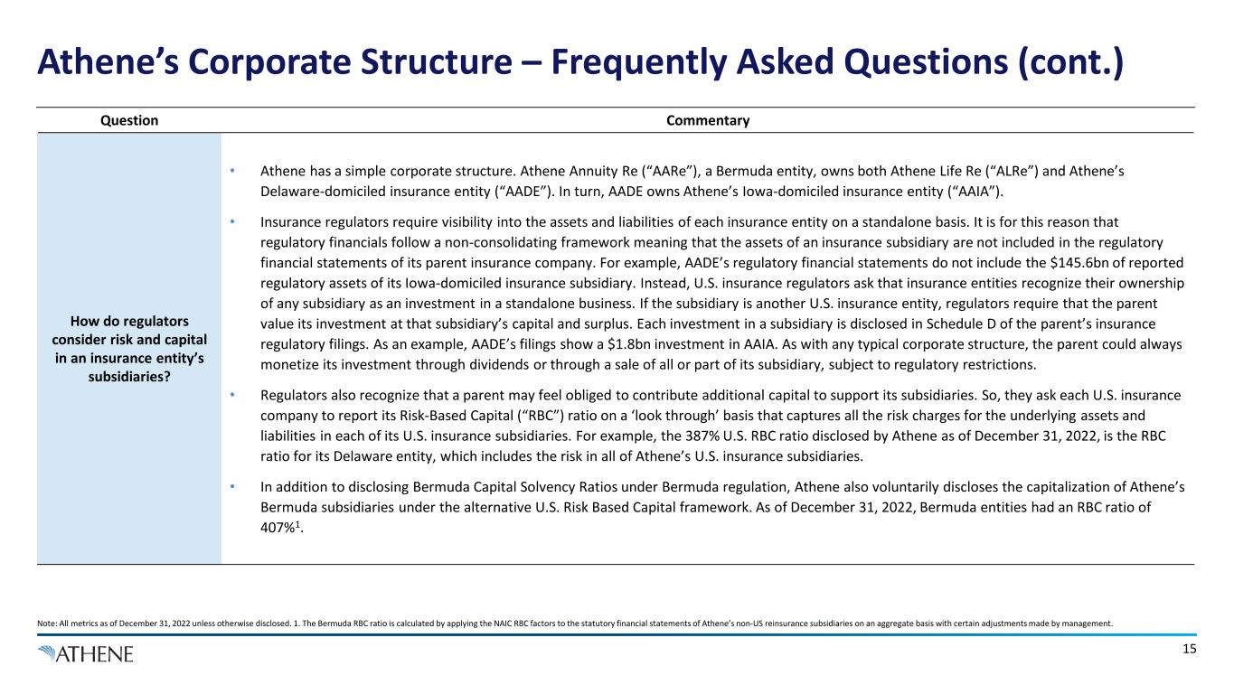 14 Athene’s Corporate Structure – Frequently Asked Questions (cont.) Note: All metrics as of December 31, 2022 unless otherwise disclosed. 1. Represents ratings for primary insurance subsidiaries. 2. See slide 11 for the definitions of Bermuda RBC and Consolidated RBC. 3. Statutory capital is also referred to as ‘regulatory capital’ in this presentation and is presented here as of December 31, 2022. Statutory capital excludes noncontrolling interest in Athene Co-Invest Reinsurance Affiliate (“ACRA”). 4. Excess capital is capital in excess of the amount required to support Athene’s core operating strategies. 5. Untapped debt capacity assumes capacity of 25% adjusted debt to capitalization and is subject to general availability and market conditions. Question Commentary How does Athene capitalize its insurance entities? • Athene is well-capitalized. Athene is rated A1 by Moody’s, A+ by S&P, A+ by Fitch, and A by AM Best1. Athene’s intention is to achieve additional ratings upgrades from each of these agencies and the company currently holds capital in excess of ‘AA’ levels under the S&P capital model. • Athene’s Bermuda entities are managed to substantially similar reserving standards as Athene’s U.S. entities. Athene’s Bermuda balance sheets are managed under the reserving and capital standards implied by each of Bermuda regulators, U.S. regulators, and its four ratings agencies, and Athene is managed to the most binding of those capital regimes at any given time. Currently, the most binding is the target of S&P ‘AA’ capitalization. Athene does not select the domicile in which to hold a particular type of business or business written in a particular market environment based on the capital or reserving standards of that jurisdiction. Athene does not ‘shop’ between jurisdictions. • Athene manages capital in line with its view of the economic risk in each entity (capital is held by the entity bearing the risk). Athene’s Bermuda subsidiaries are managed to substantially similar reserving and capital levels as the U.S. insurance entities that report on a U.S. Risk Based Capital (“RBC”) metric. As of December 31, 2022, Athene’s Bermudian reinsurance subsidiaries had a combined RBC of 407%, Athene’s U.S. subsidiaries had a combined RBC of 387% and Athene consolidated had an RBC of 416%2. • As of December 31, 2022, Athene had $20 billion3 of regulatory capital excluding ACRA noncontrolling interest. • As of December 31, 2022, Athene had access to ~$5.2 billion of deployable capital, including: i) $2.3 billion4 of regulatory capital viewed as excess equity capital, ii) $2.7 billion of untapped debt capacity5, and iii) access to $0.2 billion of undrawn capital at ACRA, Athene’s strategic sidecar structure.