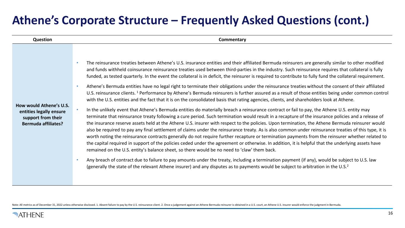 15 Athene’s Corporate Structure – Frequently Asked Questions (cont.) Note: All metrics as of December 31, 2022 unless otherwise disclosed. 1. The Bermuda RBC ratio is calculated by applying the NAIC RBC factors to the statutory financial statements of Athene’s non-US reinsurance subsidiaries on an aggregate basis with certain adjustments made by management. Question Commentary How do regulators consider risk and capital in an insurance entity’s subsidiaries? • Athene has a simple corporate structure. Athene Annuity Re (“AARe”), a Bermuda entity, owns both Athene Life Re (“ALRe”) and Athene’s Delaware-domiciled insurance entity (“AADE”). In turn, AADE owns Athene’s Iowa-domiciled insurance entity (“AAIA”). • Insurance regulators require visibility into the assets and liabilities of each insurance entity on a standalone basis. It is for this reason that regulatory financials follow a non-consolidating framework meaning that the assets of an insurance subsidiary are not included in the regulatory financial statements of its parent insurance company. For example, AADE’s regulatory financial statements do not include the $145.6bn of reported regulatory assets of its Iowa-domiciled insurance subsidiary. Instead, U.S. insurance regulators ask that insurance entities recognize their ownership of any subsidiary as an investment in a standalone business. If the subsidiary is another U.S. insurance entity, regulators require that the parent value its investment at that subsidiary’s capital and surplus. Each investment in a subsidiary is disclosed in Schedule D of the parent’s insurance regulatory filings. As an example, AADE’s filings show a $1.8bn investment in AAIA. As with any typical corporate structure, the parent could always monetize its investment through dividends or through a sale of all or part of its subsidiary, subject to regulatory restrictions. • Regulators also recognize that a parent may feel obliged to contribute additional capital to support its subsidiaries. So, they ask each U.S. insurance company to report its Risk-Based Capital (“RBC”) ratio on a ‘look through’ basis that captures all the risk charges for the underlying assets and liabilities in each of its U.S. insurance subsidiaries. For example, the 387% U.S. RBC ratio disclosed by Athene as of December 31, 2022, is the RBC ratio for its Delaware entity, which includes the risk in all of Athene’s U.S. insurance subsidiaries. • In addition to disclosing Bermuda Capital Solvency Ratios under Bermuda regulation, Athene also voluntarily discloses the capitalization of Athene’s Bermuda subsidiaries under the alternative U.S. Risk Based Capital framework. As of December 31, 2022, Bermuda entities had an RBC ratio of 407%1.