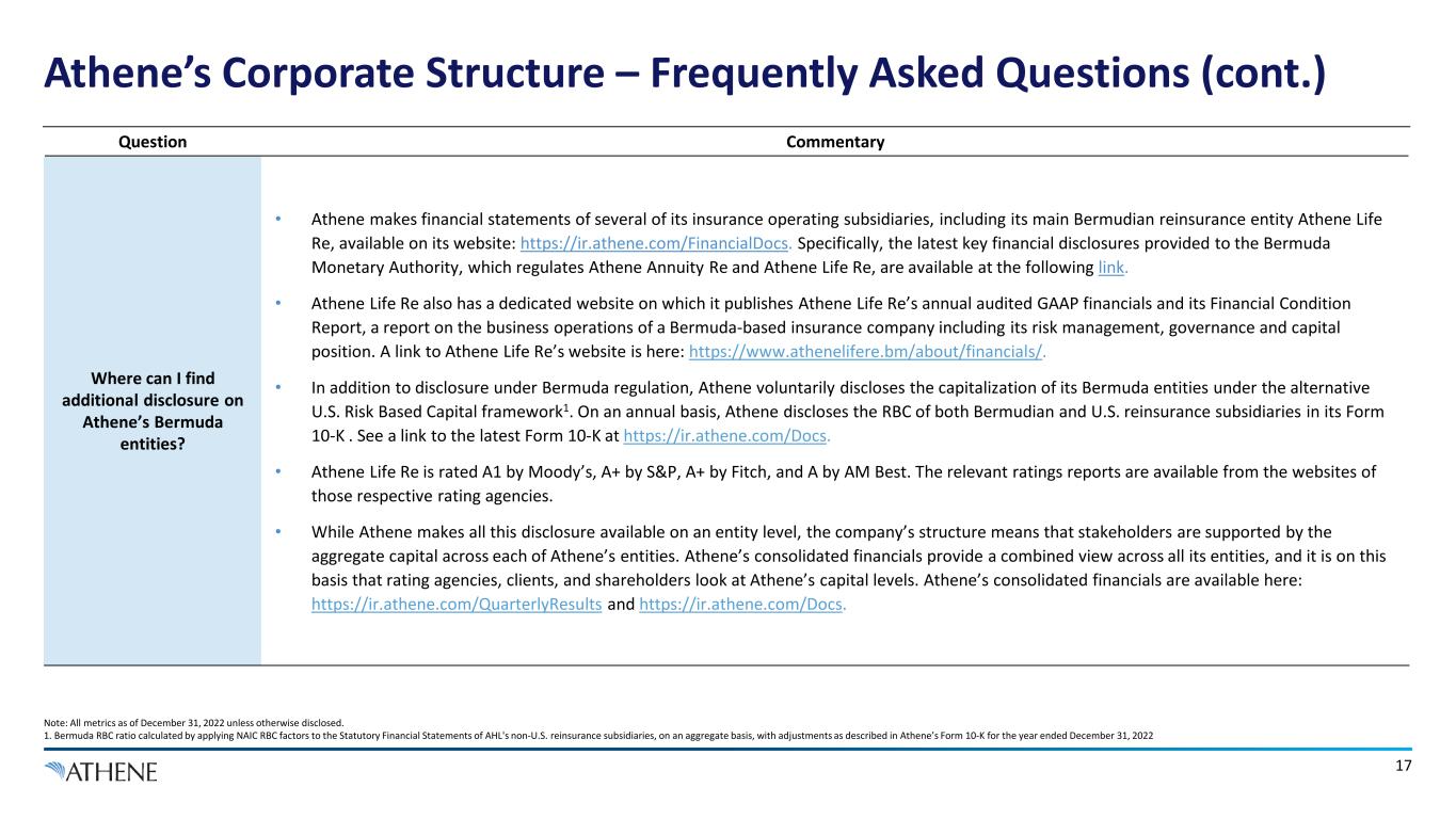 16 Athene’s Corporate Structure – Frequently Asked Questions (cont.) Note: All metrics as of December 31, 2022 unless otherwise disclosed. 1. Absent failure to pay by the U.S. reinsurance client. 2. Once a judgement against an Athene Bermuda reinsurer is obtained in a U.S. court, an Athene U.S. insurer would enforce the judgment in Bermuda. Question Commentary How would Athene’s U.S. entities legally ensure support from their Bermuda affiliates? • The reinsurance treaties between Athene’s U.S. insurance entities and their affiliated Bermuda reinsurers are generally similar to other modified and funds withheld coinsurance reinsurance treaties used between third-parties in the industry. Such reinsurance requires that collateral is fully funded, as tested quarterly. In the event the collateral is in deficit, the reinsurer is required to contribute to fully fund the collateral requirement. • Athene’s Bermuda entities have no legal right to terminate their obligations under the reinsurance treaties without the consent of their affiliated U.S. reinsurance clients. 1 Performance by Athene’s Bermuda reinsurers is further assured as a result of those entities being under common control with the U.S. entities and the fact that it is on the consolidated basis that rating agencies, clients, and shareholders look at Athene. • In the unlikely event that Athene’s Bermuda entities do materially breach a reinsurance contract or fail to pay, the Athene U.S. entity may terminate that reinsurance treaty following a cure period. Such termination would result in a recapture of the insurance policies and a release of the insurance reserve assets held at the Athene U.S. insurer with respect to the policies. Upon termination, the Athene Bermuda reinsurer would also be required to pay any final settlement of claims under the reinsurance treaty. As is also common under reinsurance treaties of this type, it is worth noting the reinsurance contracts generally do not require further recapture or termination payments from the reinsurer whether related to the capital required in support of the policies ceded under the agreement or otherwise. In addition, it is helpful that the underlying assets have remained on the U.S. entity’s balance sheet, so there would be no need to ‘claw’ them back. • Any breach of contract due to failure to pay amounts under the treaty, including a termination payment (if any), would be subject to U.S. law (generally the state of the relevant Athene insurer) and any disputes as to payments would be subject to arbitration in the U.S.2
