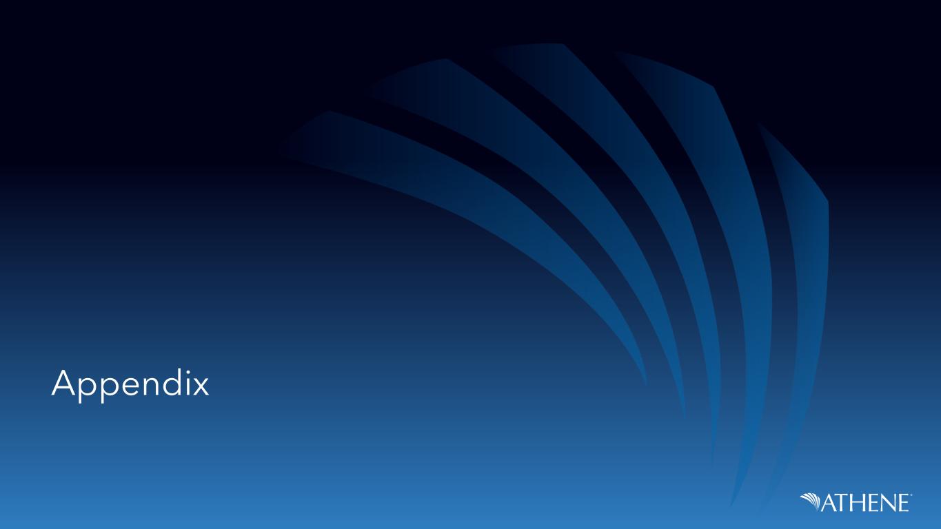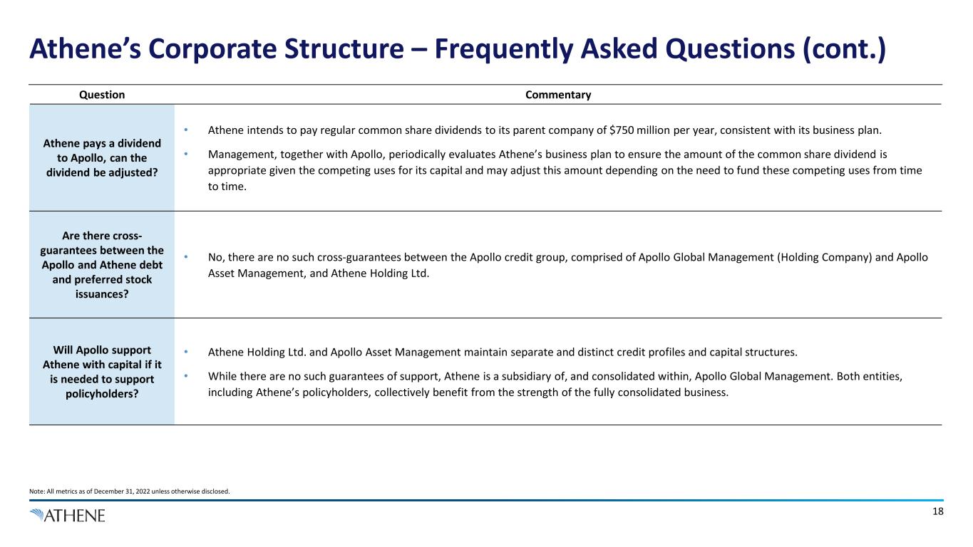 17 Athene’s Corporate Structure – Frequently Asked Questions (cont.) Note: All metrics as of December 31, 2022 unless otherwise disclosed. 1. Bermuda RBC ratio calculated by applying NAIC RBC factors to the Statutory Financial Statements of AHL's non-U.S. reinsurance subsidiaries, on an aggregate basis, with adjustments as described in Athene’s Form 10-K for the year ended December 31, 2022 Question Commentary Where can I find additional disclosure on Athene’s Bermuda entities? • Athene makes financial statements of several of its insurance operating subsidiaries, including its main Bermudian reinsurance entity Athene Life Re, available on its website: https://ir.athene.com/FinancialDocs. Specifically, the latest key financial disclosures provided to the Bermuda Monetary Authority, which regulates Athene Annuity Re and Athene Life Re, are available at the following link. • Athene Life Re also has a dedicated website on which it publishes Athene Life Re’s annual audited GAAP financials and its Financial Condition Report, a report on the business operations of a Bermuda-based insurance company including its risk management, governance and capital position. A link to Athene Life Re’s website is here: https://www.athenelifere.bm/about/financials/. • In addition to disclosure under Bermuda regulation, Athene voluntarily discloses the capitalization of its Bermuda entities under the alternative U.S. Risk Based Capital framework1. On an annual basis, Athene discloses the RBC of both Bermudian and U.S. reinsurance subsidiaries in its Form 10-K . See a link to the latest Form 10-K at https://ir.athene.com/Docs. • Athene Life Re is rated A1 by Moody’s, A+ by S&P, A+ by Fitch, and A by AM Best. The relevant ratings reports are available from the websites of those respective rating agencies. • While Athene makes all this disclosure available on an entity level, the company’s structure means that stakeholders are supported by the aggregate capital across each of Athene’s entities. Athene’s consolidated financials provide a combined view across all its entities, and it is on this basis that rating agencies, clients, and shareholders look at Athene’s capital levels. Athene’s consolidated financials are available here: https://ir.athene.com/QuarterlyResults and https://ir.athene.com/Docs.