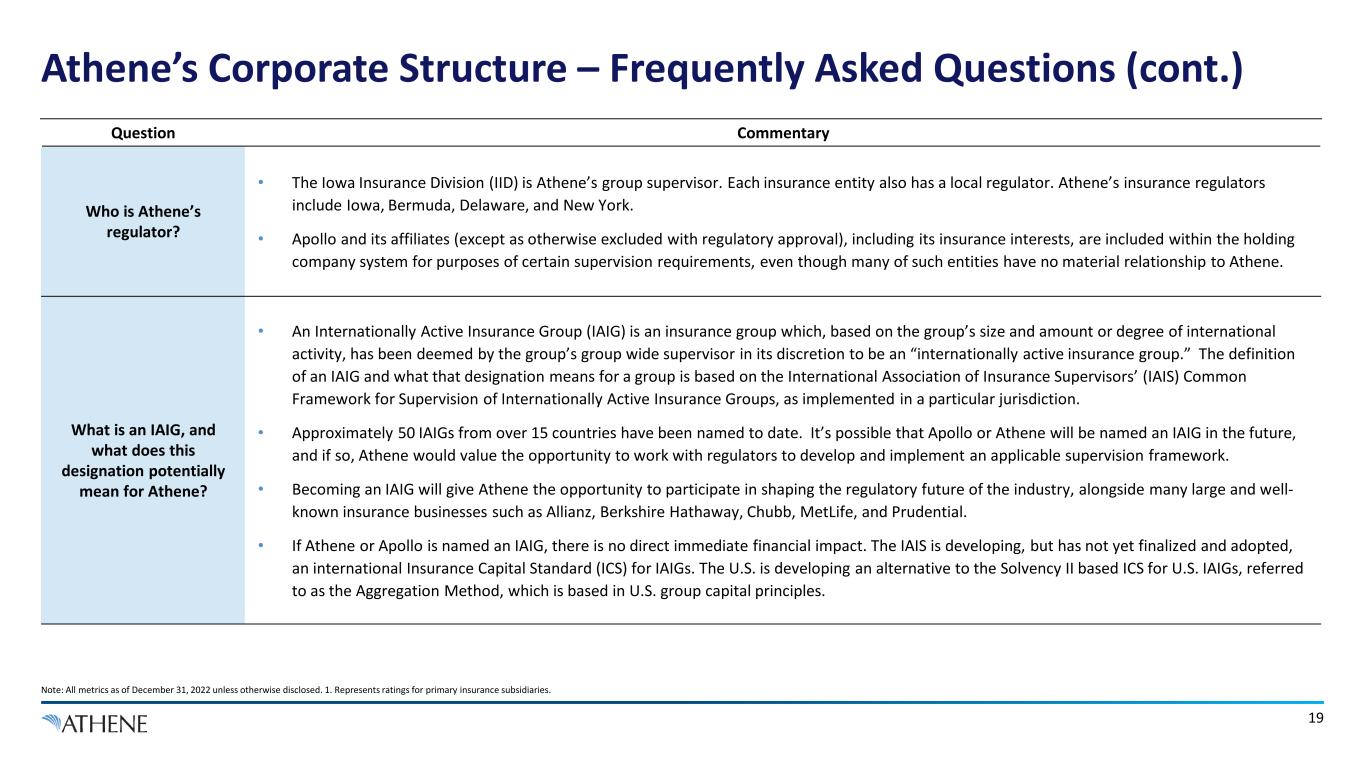 18 Athene’s Corporate Structure – Frequently Asked Questions (cont.) Note: All metrics as of December 31, 2022 unless otherwise disclosed. Question Commentary Athene pays a dividend to Apollo, can the dividend be adjusted? • Athene intends to pay regular common share dividends to its parent company of $750 million per year, consistent with its business plan. • Management, together with Apollo, periodically evaluates Athene’s business plan to ensure the amount of the common share dividend is appropriate given the competing uses for its capital and may adjust this amount depending on the need to fund these competing uses from time to time. Are there cross- guarantees between the Apollo and Athene debt and preferred stock issuances? • No, there are no such cross-guarantees between the Apollo credit group, comprised of Apollo Global Management (Holding Company) and Apollo Asset Management, and Athene Holding Ltd. Will Apollo support Athene with capital if it is needed to support policyholders? • Athene Holding Ltd. and Apollo Asset Management maintain separate and distinct credit profiles and capital structures. • While there are no such guarantees of support, Athene is a subsidiary of, and consolidated within, Apollo Global Management. Both entities, including Athene’s policyholders, collectively benefit from the strength of the fully consolidated business.