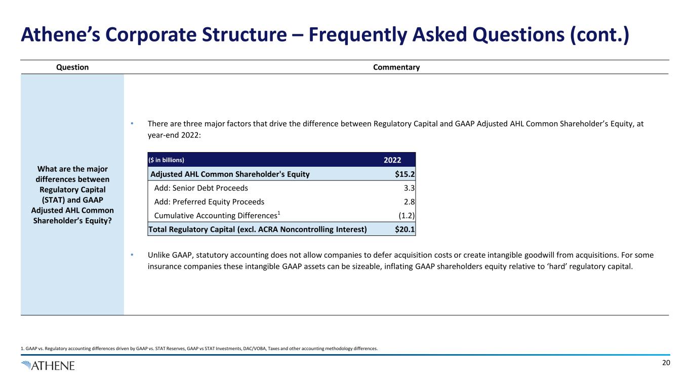 19 Athene’s Corporate Structure – Frequently Asked Questions (cont.) Note: All metrics as of December 31, 2022 unless otherwise disclosed. 1. Represents ratings for primary insurance subsidiaries. Question Commentary Who is Athene’s regulator? • The Iowa Insurance Division (IID) is Athene’s group supervisor. Each insurance entity also has a local regulator. Athene’s insurance regulators include Iowa, Bermuda, Delaware, and New York. • Apollo and its affiliates (except as otherwise excluded with regulatory approval), including its insurance interests, are included within the holding company system for purposes of certain supervision requirements, even though many of such entities have no material relationship to Athene. What is an IAIG, and what does this designation potentially mean for Athene? • An Internationally Active Insurance Group (IAIG) is an insurance group which, based on the group’s size and amount or degree of international activity, has been deemed by the group’s group wide supervisor in its discretion to be an “internationally active insurance group.” The definition of an IAIG and what that designation means for a group is based on the International Association of Insurance Supervisors’ (IAIS) Common Framework for Supervision of Internationally Active Insurance Groups, as implemented in a particular jurisdiction. • Approximately 50 IAIGs from over 15 countries have been named to date. It’s possible that Apollo or Athene will be named an IAIG in the future, and if so, Athene would value the opportunity to work with regulators to develop and implement an applicable supervision framework. • Becoming an IAIG will give Athene the opportunity to participate in shaping the regulatory future of the industry, alongside many large and well- known insurance businesses such as Allianz, Berkshire Hathaway, Chubb, MetLife, and Prudential. • If Athene or Apollo is named an IAIG, there is no direct immediate financial impact. The IAIS is developing, but has not yet finalized and adopted, an international Insurance Capital Standard (ICS) for IAIGs. The U.S. is developing an alternative to the Solvency II based ICS for U.S. IAIGs, referred to as the Aggregation Method, which is based in U.S. group capital principles.