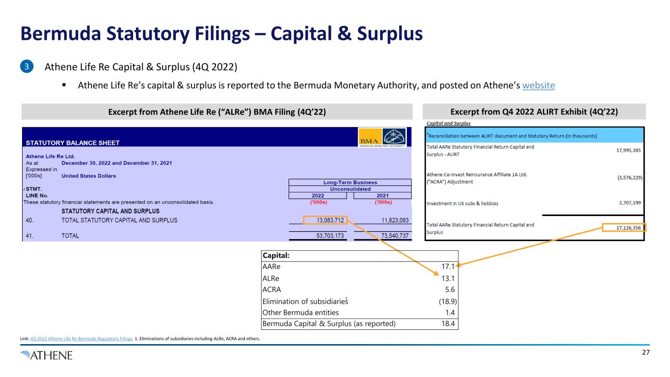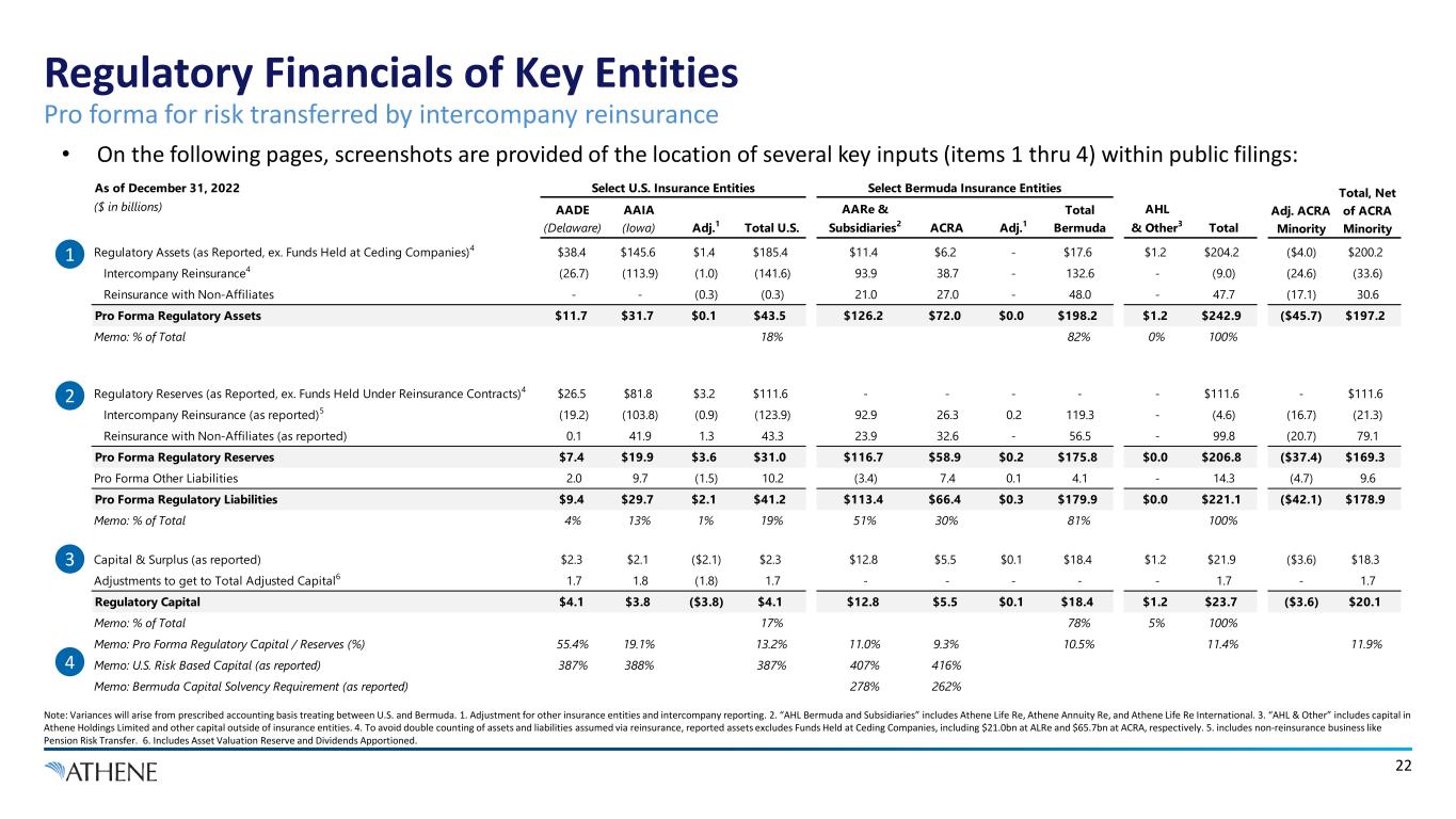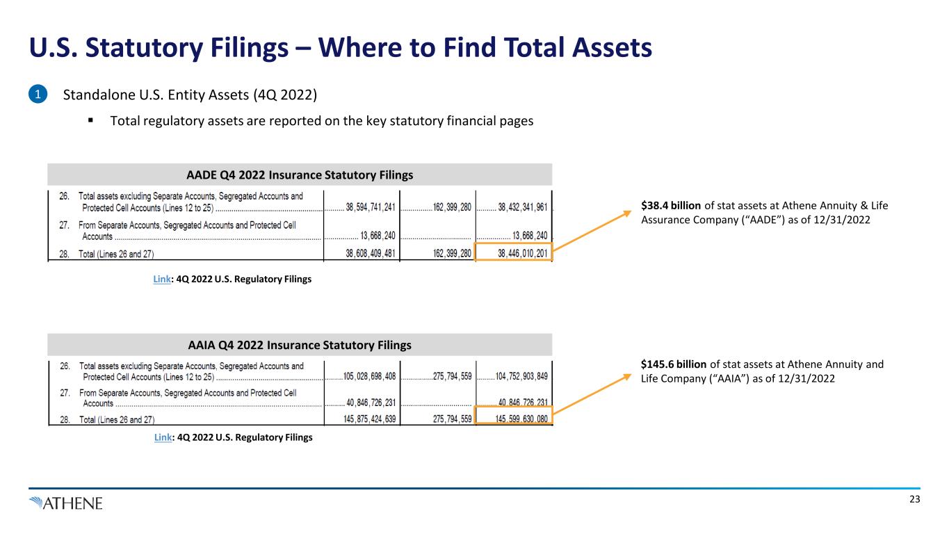 22 Regulatory Financials of Key Entities Note: Variances will arise from prescribed accounting basis treating between U.S. and Bermuda. 1. Adjustment for other insurance entities and intercompany reporting. 2. “AHL Bermuda and Subsidiaries” includes Athene Life Re, Athene Annuity Re, and Athene Life Re International. 3. “AHL & Other” includes capital in Athene Holdings Limited and other capital outside of insurance entities. 4. To avoid double counting of assets and liabilities assumed via reinsurance, reported assets excludes Funds Held at Ceding Companies, including $21.0bn at ALRe and $65.7bn at ACRA, respectively. 5. includes non-reinsurance business like Pension Risk Transfer. 6. Includes Asset Valuation Reserve and Dividends Apportioned. Pro forma for risk transferred by intercompany reinsurance • On the following pages, screenshots are provided of the location of several key inputs (items 1 thru 4) within public filings: 1 2 3 4 As of December 31, 2022 Select U.S. Insurance Entities Select Bermuda Insurance Entities ($ in billions) AADE (Delaware) AAIA (Iowa) Adj.1 Total U.S. AARe & Subsidiaries2 ACRA Adj.1 Total Bermuda AHL & Other3 Total Regulatory Assets (as Reported, ex. Funds Held at Ceding Companies)4 $38.4 $145.6 $1.4 $185.4 $11.4 $6.2 - $17.6 $1.2 $204.2 ($4.0) $200.2 Intercompany Reinsurance4 (26.7) (113.9) (1.0) (141.6) 93.9 38.7 - 132.6 - (9.0) (24.6) (33.6) Reinsurance with Non-Affiliates - - (0.3) (0.3) 21.0 27.0 - 48.0 - 47.7 (17.1) 30.6 Pro Forma Regulatory Assets $11.7 $31.7 $0.1 $43.5 $126.2 $72.0 $0.0 $198.2 $1.2 $242.9 ($45.7) $197.2 Memo: % of Total 18% 82% 0% 100% Regulatory Reserves (as Reported, ex. Funds Held Under Reinsurance Contracts)4 $26.5 $81.8 $3.2 $111.6 - - - - - $111.6 - $111.6 Intercompany Reinsurance (as reported)5 (19.2) (103.8) (0.9) (123.9) 92.9 26.3 0.2 119.3 - (4.6) (16.7) (21.3) Reinsurance with Non-Affiliates (as reported) 0.1 41.9 1.3 43.3 23.9 32.6 - 56.5 - 99.8 (20.7) 79.1 Pro Forma Regulatory Reserves $7.4 $19.9 $3.6 $31.0 $116.7 $58.9 $0.2 $175.8 $0.0 $206.8 ($37.4) $169.3 Pro Forma Other Liabilities 2.0 9.7 (1.5) 10.2 (3.4) 7.4 0.1 4.1 - 14.3 (4.7) 9.6 Pro Forma Regulatory Liabilities $9.4 $29.7 $2.1 $41.2 $113.4 $66.4 $0.3 $179.9 $0.0 $221.1 ($42.1) $178.9 Memo: % of Total 4% 13% 1% 19% 51% 30% 81% 100% Capital & Surplus (as reported) $2.3 $2.1 ($2.1) $2.3 $12.8 $5.5 $0.1 $18.4 $1.2 $21.9 ($3.6) $18.3 Adjustments to get to Total Adjusted Capital6 1.7 1.8 (1.8) 1.7 - - - - - 1.7 - 1.7 Regulatory Capital $4.1 $3.8 ($3.8) $4.1 $12.8 $5.5 $0.1 $18.4 $1.2 $23.7 ($3.6) $20.1 Memo: % of Total 17% 78% 5% 100% Memo: Pro Forma Regulatory Capital / Reserves (%) 55.4% 19.1% 13.2% 11.0% 9.3% 10.5% 11.4% 11.9% Memo: U.S. Risk Based Capital (as reported) 387% 388% 387% 407% 416% Memo: Bermuda Capital Solvency Requirement (as reported) 278% 262% Total, Net of ACRA Minority Adj. ACRA Minority