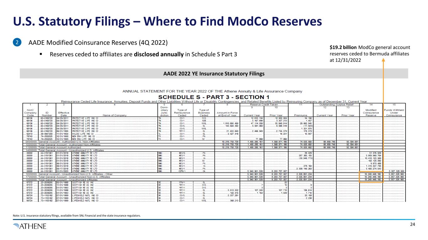 • Standalone U.S. Entity Assets (4Q 2022)  Total regulatory assets are reported on the key statutory financial pages 23 U.S. Statutory Filings – Where to Find Total Assets AAIA Q4 2022 Insurance Statutory Filings AADE Q4 2022 Insurance Statutory Filings Link: 4Q 2022 U.S. Regulatory Filings Link: 4Q 2022 U.S. Regulatory Filings $145.6 billion of stat assets at Athene Annuity and Life Company (“AAIA”) as of 12/31/2022 $38.4 billion of stat assets at Athene Annuity & Life Assurance Company (“AADE”) as of 12/31/2022 1