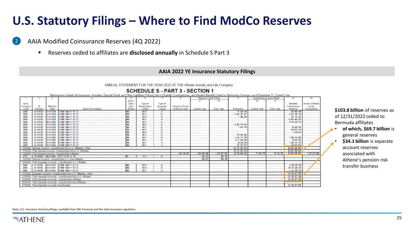 AADE 2022 YE Insurance Statutory Filings 24 U.S. Statutory Filings – Where to Find ModCo Reserves Note: U.S. insurance statutory filings, available from SNL Financial and the state insurance regulators. $19.2 billion ModCo general account reserves ceded to Bermuda affiliates at 12/31/2022 • AADE Modified Coinsurance Reserves (4Q 2022)  Reserves ceded to affiliates are disclosed annually in Schedule S Part 3 2