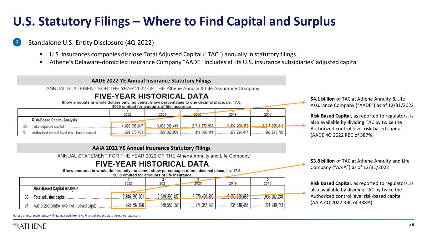 27 Bermuda Statutory Filings – Capital & Surplus Link: 4Q 2022 Athene Life Re Bermuda Regulatory Filings. 1. Eliminations of subsidiaries including ALRe, ACRA and others. • Athene Life Re Capital & Surplus (4Q 2022)  Athene Life Re’s capital & surplus is reported to the Bermuda Monetary Authority, and posted on Athene’s website 3 Excerpt from Athene Life Re (“ALRe”) BMA Filing (4Q’22) Excerpt from Q4 2022 ALIRT Exhibit (4Q’22) Capital: AARe 17.1 ALRe 13.1 ACRA 5.6 Elimination of subsidiaries1 (18.9) Other Bermuda entities 1.4 Bermuda Capital & Surplus (as reported) 18.4