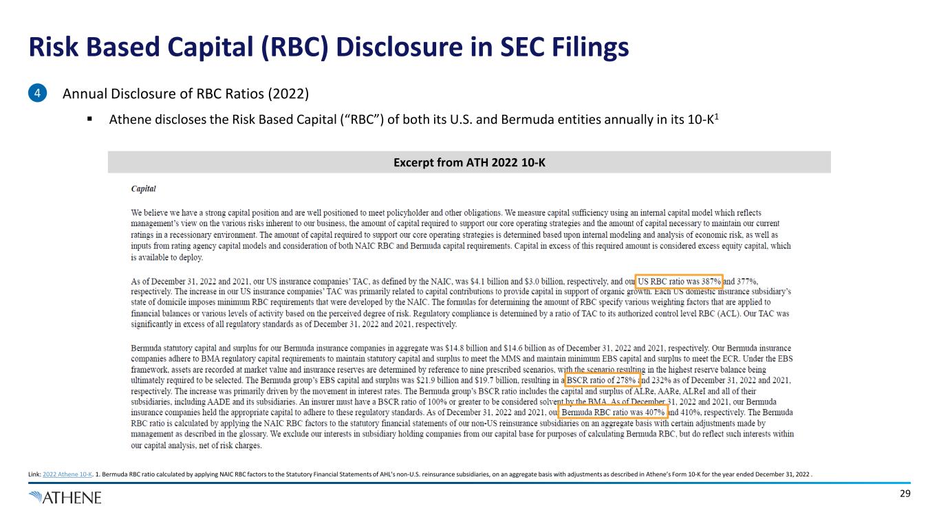 28 U.S. Statutory Filings – Where to Find Capital and Surplus • Standalone U.S. Entity Disclosure (4Q 2022)  U.S. insurances companies disclose Total Adjusted Capital (“TAC”) annually in statutory filings  Athene’s Delaware-domiciled insurance Company “AADE” includes all its U.S. insurance subsidiaries’ adjusted capital 3 AAIA 2022 YE Annual Insurance Statutory Filings AADE 2022 YE Annual Insurance Statutory Filings Risk Based Capital, as reported to regulators, is also available by dividing TAC by twice the Authorized control level risk-based capital (AAIA 4Q 2022 RBC of 388%) $4.1 billion of TAC at Athene Annuity & Life Assurance Company (“AADE”) as of 12/31/2022 $3.8 billion of TAC at Athene Annuity and Life Company (“AAIA”) as of 12/31/2022 Note: U.S. insurance statutory filings, available from SNL Financial and the state insurance regulators. Risk Based Capital, as reported to regulators, is also available by dividing TAC by twice the Authorized control level risk-based capital (AADE 4Q 2022 RBC of 387%)