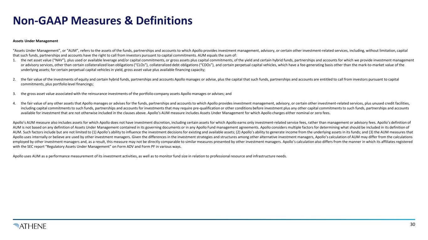 Non-GAAP Measures & Definitions 30 Assets Under Management “Assets Under Management”, or “AUM”, refers to the assets of the funds, partnerships and accounts to which Apollo provides investment management, advisory, or certain other investment-related services, including, without limitation, capital that such funds, partnerships and accounts have the right to call from investors pursuant to capital commitments. AUM equals the sum of: 1. the net asset value (“NAV”), plus used or available leverage and/or capital commitments, or gross assets plus capital commitments, of the yield and certain hybrid funds, partnerships and accounts for which we provide investment management or advisory services, other than certain collateralized loan obligations (“CLOs”), collateralized debt obligations (“CDOs”), and certain perpetual capital vehicles, which have a fee-generating basis other than the mark-to-market value of the underlying assets; for certain perpetual capital vehicles in yield, gross asset value plus available financing capacity; 2. the fair value of the investments of equity and certain hybrid funds, partnerships and accounts Apollo manages or advise, plus the capital that such funds, partnerships and accounts are entitled to call from investors pursuant to capital commitments, plus portfolio level financings; 3. the gross asset value associated with the reinsurance investments of the portfolio company assets Apollo manages or advises; and 4. the fair value of any other assets that Apollo manages or advises for the funds, partnerships and accounts to which Apollo provides investment management, advisory, or certain other investment-related services, plus unused credit facilities, including capital commitments to such funds, partnerships and accounts for investments that may require pre-qualification or other conditions before investment plus any other capital commitments to such funds, partnerships and accounts available for investment that are not otherwise included in the clauses above. Apollo’s AUM measure includes Assets Under Management for which Apollo charges either nominal or zero fees. Apollo’s AUM measure also includes assets for which Apollo does not have investment discretion, including certain assets for which Apollo earns only investment-related service fees, rather than management or advisory fees. Apollo’s definition of AUM is not based on any definition of Assets Under Management contained in its governing documents or in any Apollo Fund management agreements. Apollo considers multiple factors for determining what should be included in its definition of AUM. Such factors include but are not limited to (1) Apollo’s ability to influence the investment decisions for existing and available assets; (2) Apollo’s ability to generate income from the underlying assets in its funds; and (3) the AUM measures that Apollo uses internally or believe are used by other investment managers. Given the differences in the investment strategies and structures among other alternative investment managers, Apollo’s calculation of AUM may differ from the calculations employed by other investment managers and, as a result, this measure may not be directly comparable to similar measures presented by other investment managers. Apollo’s calculation also differs from the manner in which its affiliates registered with the SEC report “Regulatory Assets Under Management” on Form ADV and Form PF in various ways. Apollo uses AUM as a performance measurement of its investment activities, as well as to monitor fund size in relation to professional resource and infrastructure needs.