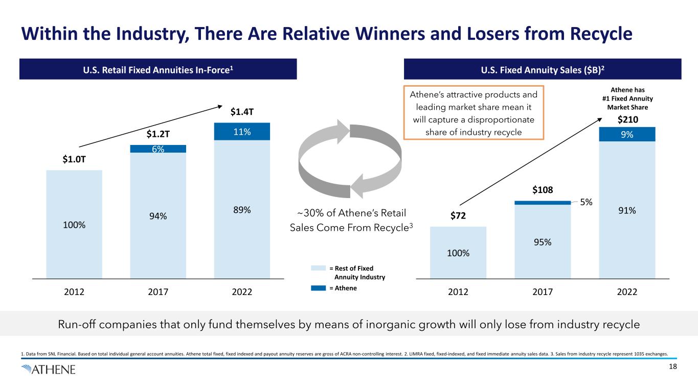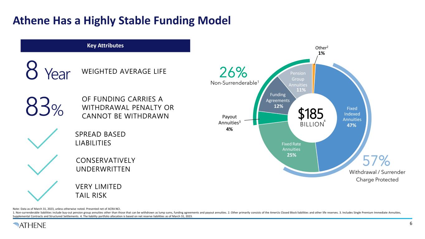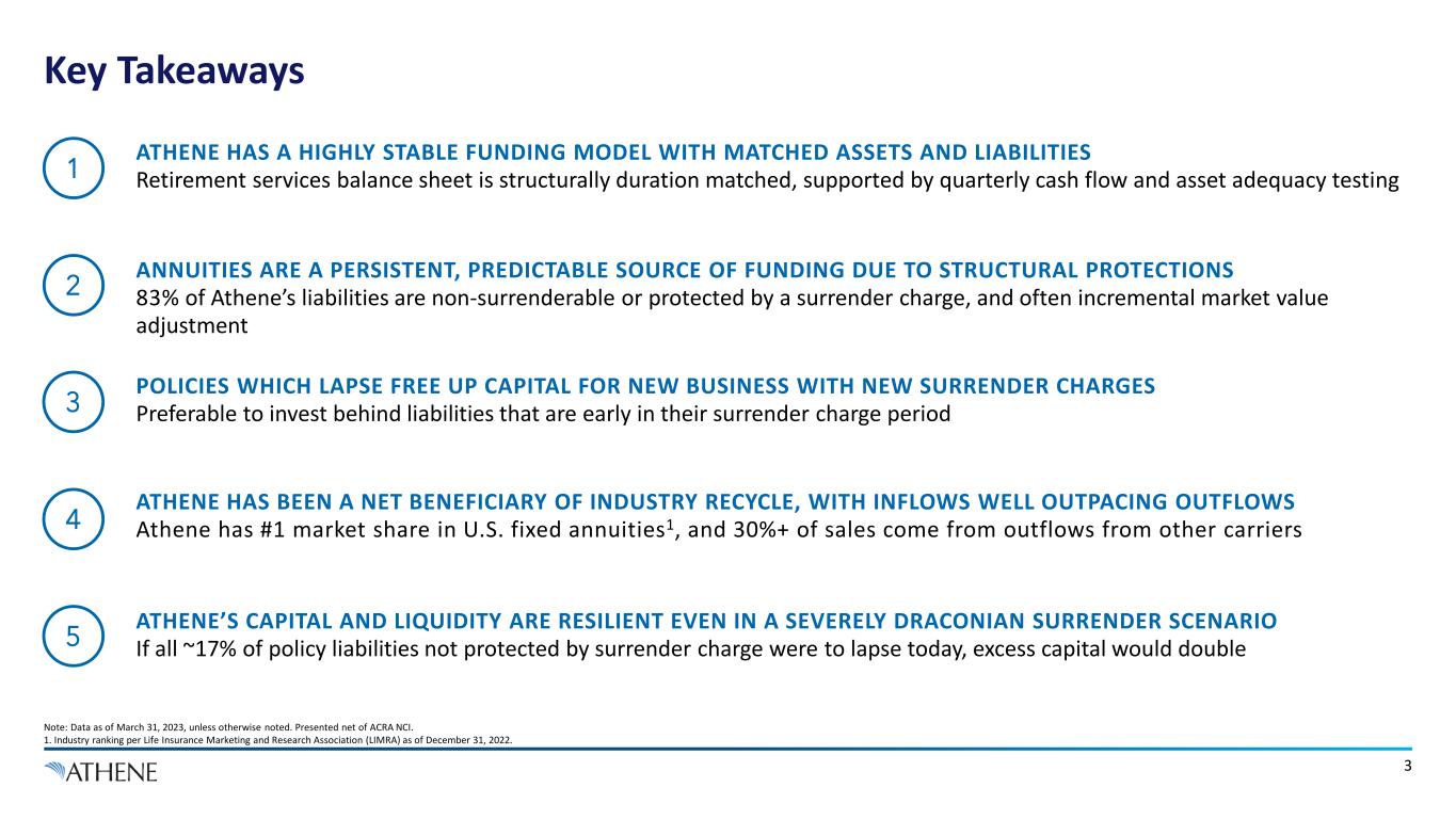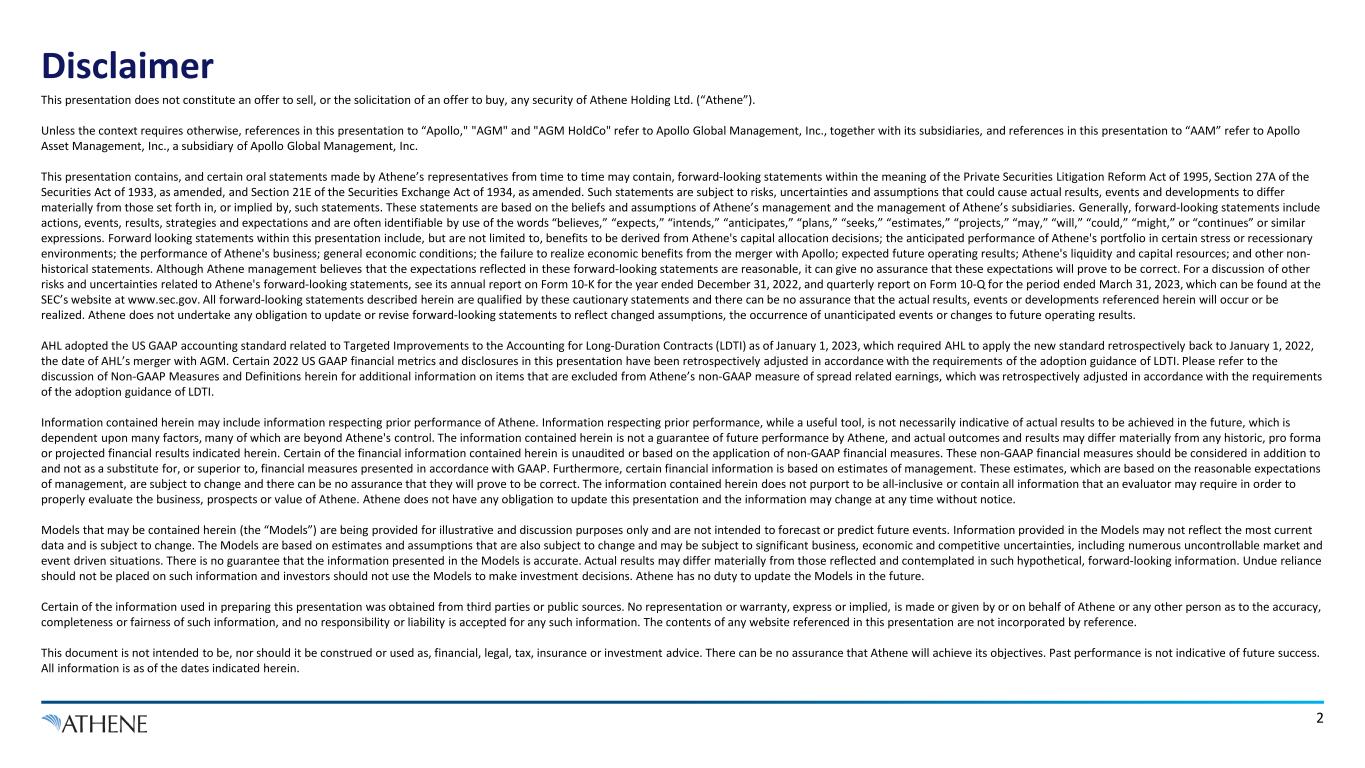 Disclaimer This presentation does not constitute an offer to sell, or the solicitation of an offer to buy, any security of Athene Holding Ltd. (“Athene”). Unless the context requires otherwise, references in this presentation to “Apollo," "AGM" and "AGM HoldCo" refer to Apollo Global Management, Inc., together with its subsidiaries, and references in this presentation to “AAM” refer to Apollo Asset Management, Inc., a subsidiary of Apollo Global Management, Inc. This presentation contains, and certain oral statements made by Athene’s representatives from time to time may contain, forward-looking statements within the meaning of the Private Securities Litigation Reform Act of 1995, Section 27A of the Securities Act of 1933, as amended, and Section 21E of the Securities Exchange Act of 1934, as amended. Such statements are subject to risks, uncertainties and assumptions that could cause actual results, events and developments to differ materially from those set forth in, or implied by, such statements. These statements are based on the beliefs and assumptions of Athene’s management and the management of Athene’s subsidiaries. Generally, forward-looking statements include actions, events, results, strategies and expectations and are often identifiable by use of the words “believes,” “expects,” “intends,” “anticipates,” “plans,” “seeks,” “estimates,” “projects,” “may,” “will,” “could,” “might,” or “continues” or similar expressions. Forward looking statements within this presentation include, but are not limited to, benefits to be derived from Athene's capital allocation decisions; the anticipated performance of Athene's portfolio in certain stress or recessionary environments; the performance of Athene's business; general economic conditions; the failure to realize economic benefits from the merger with Apollo; expected future operating results; Athene's liquidity and capital resources; and other non- historical statements. Although Athene management believes that the expectations reflected in these forward-looking statements are reasonable, it can give no assurance that these expectations will prove to be correct. For a discussion of other risks and uncertainties related to Athene's forward-looking statements, see its annual report on Form 10-K for the year ended December 31, 2022, and quarterly report on Form 10-Q for the period ended March 31, 2023, which can be found at the SEC’s website at www.sec.gov. All forward-looking statements described herein are qualified by these cautionary statements and there can be no assurance that the actual results, events or developments referenced herein will occur or be realized. Athene does not undertake any obligation to update or revise forward-looking statements to reflect changed assumptions, the occurrence of unanticipated events or changes to future operating results. AHL adopted the US GAAP accounting standard related to Targeted Improvements to the Accounting for Long-Duration Contracts (LDTI) as of January 1, 2023, which required AHL to apply the new standard retrospectively back to January 1, 2022, the date of AHL’s merger with AGM. Certain 2022 US GAAP financial metrics and disclosures in this presentation have been retrospectively adjusted in accordance with the requirements of the adoption guidance of LDTI. Please refer to the discussion of Non-GAAP Measures and Definitions herein for additional information on items that are excluded from Athene’s non-GAAP measure of spread related earnings, which was retrospectively adjusted in accordance with the requirements of the adoption guidance of LDTI. Information contained herein may include information respecting prior performance of Athene. Information respecting prior performance, while a useful tool, is not necessarily indicative of actual results to be achieved in the future, which is dependent upon many factors, many of which are beyond Athene's control. The information contained herein is not a guarantee of future performance by Athene, and actual outcomes and results may differ materially from any historic, pro forma or projected financial results indicated herein. Certain of the financial information contained herein is unaudited or based on the application of non-GAAP financial measures. These non-GAAP financial measures should be considered in addition to and not as a substitute for, or superior to, financial measures presented in accordance with GAAP. Furthermore, certain financial information is based on estimates of management. These estimates, which are based on the reasonable expectations of management, are subject to change and there can be no assurance that they will prove to be correct. The information contained herein does not purport to be all-inclusive or contain all information that an evaluator may require in order to properly evaluate the business, prospects or value of Athene. Athene does not have any obligation to update this presentation and the information may change at any time without notice. Models that may be contained herein (the “Models”) are being provided for illustrative and discussion purposes only and are not intended to forecast or predict future events. Information provided in the Models may not reflect the most current data and is subject to change. The Models are based on estimates and assumptions that are also subject to change and may be subject to significant business, economic and competitive uncertainties, including numerous uncontrollable market and event driven situations. There is no guarantee that the information presented in the Models is accurate. Actual results may differ materially from those reflected and contemplated in such hypothetical, forward-looking information. Undue reliance should not be placed on such information and investors should not use the Models to make investment decisions. Athene has no duty to update the Models in the future. Certain of the 
