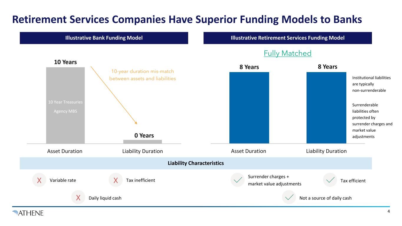 3 Key Takeaways Note: Data as of March 31, 2023, unless otherwise noted. Presented net of ACRA NCI. 1. Industry ranking per Life Insurance Marketing and Research Association (LIMRA) as of December 31, 2022. 3 1 ATHENE HAS BEEN A NET BENEFICIARY OF INDUSTRY RECYCLE, WITH INFLOWS WELL OUTPACING OUTFLOWS Athene has #1 market share in U.S. fixed annuities1, and 30%+ of sales come from outflows from other carriers4 2 ANNUITIES ARE A PERSISTENT, PREDICTABLE SOURCE OF FUNDING DUE TO STRUCTURAL PROTECTIONS 83% of Athene’s liabilities are non-surrenderable or protected by a surrender charge, and often incremental market value adjustment ATHENE’S CAPITAL AND LIQUIDITY ARE RESILIENT EVEN IN A SEVERELY DRACONIAN SURRENDER SCENARIO If all ~17% of policy liabilities not protected by surrender charge were to lapse today, excess capital would double5 POLICIES WHICH LAPSE FREE UP CAPITAL FOR NEW BUSINESS WITH NEW SURRENDER CHARGES Preferable to invest behind liabilities that are early in their surrender charge period ATHENE HAS A HIGHLY STABLE FUNDING MODEL WITH MATCHED ASSETS AND LIABILITIES Retirement services balance sheet is structurally duration matched, supported by quarterly cash flow and asset adequacy testing