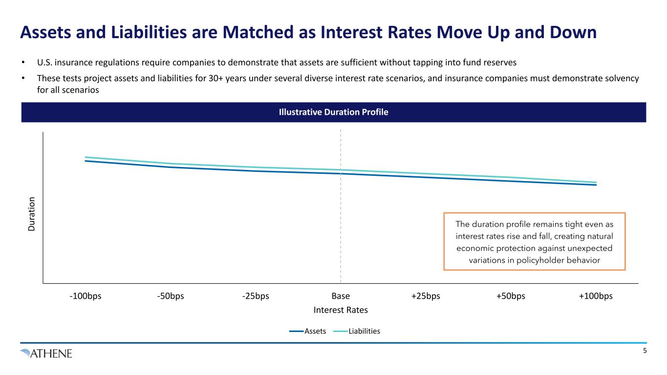 Retirement Services Companies Have Superior Funding Models to Banks Illustrative Bank Funding Model Illustrative Retirement Services Funding Model 10 Years 0 Years Asset Duration Liability Duration 10-year duration mis-match between assets and liabilities 10 Year Treasuries Agency MBS 8 Years 8 Years Asset Duration Liability Duration Fully Matched Institutional liabilities are typically non-surrenderable Surrenderable liabilities often protected by surrender charges and market value adjustments Liability Characteristics Not a source of daily cash Surrender charges + market value adjustments Tax efficient Daily liquid cashX Variable rateX Tax inefficientX 4