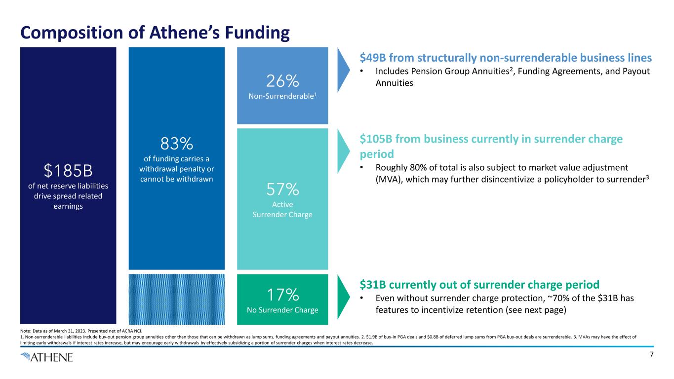 1% 47% 25% 4% 12% 11% Fixed Rate Annuities Athene Has a Highly Stable Funding Model Note: Data as of March 31, 2023, unless otherwise noted. Presented net of ACRA NCI. 1. Non-surrenderable liabilities include buy-out pension group annuities other than those that can be withdrawn as lump sums, funding agreements and payout annuities. 2. Other primarily consists of the AmerUs Closed Block liabilities and other life reserves. 3. Includes Single Premium Immediate Annuities, Supplemental Contracts and Structured Settlements. 4. The liability portfolio allocation is based on net reserve liabilities as of March 31, 2023. Pension Group Annuities Payout Annuities3 Fixed Indexed Annuities$185 BILLION 26% Non-Surrenderable1 OF FUNDING CARRIES A WITHDRAWAL PENALTY OR CANNOT BE WITHDRAWN83% SPREAD BASED LIABILITIES WEIGHTED AVERAGE LIFE8 Year 57% Withdrawal / Surrender Charge Protected Funding Agreements Other2Key Attributes 6 CONSERVATIVELY UNDERWRITTEN VERY LIMITED TAIL RISK 4