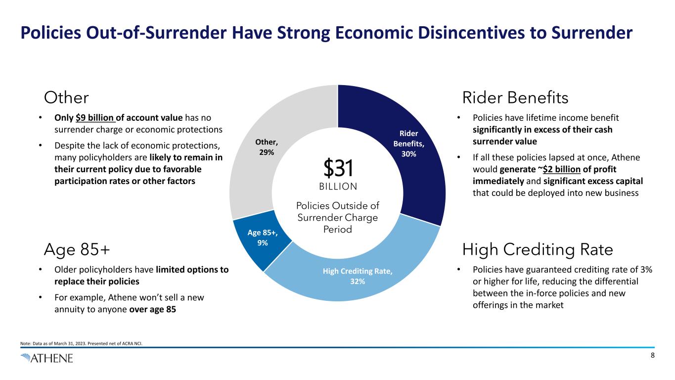 Composition of Athene’s Funding Note: Data as of March 31, 2023. Presented net of ACRA NCI. 1. Non-surrenderable liabilities include buy-out pension group annuities other than those that can be withdrawn as lump sums, funding agreements and payout annuities. 2. $1.9B of buy-in PGA deals and $0.8B of deferred lump sums from PGA buy-out deals are surrenderable. 3. MVAs may have the effect of limiting early withdrawals if interest rates increase, but may encourage early withdrawals by effectively subsidizing a portion of surrender charges when interest rates decrease. $185B of net reserve liabilities drive spread related earnings 26% Non-Surrenderable1 57% Active Surrender Charge 17% No Surrender Charge $31B currently out of surrender charge period • Even without surrender charge protection, ~70% of the $31B has features to incentivize retention (see next page) $105B from business currently in surrender charge period • Roughly 80% of total is also subject to market value adjustment (MVA), which may further disincentivize a policyholder to surrender3 $49B from structurally non-surrenderable business lines • Includes Pension Group Annuities2, Funding Agreements, and Payout Annuities 83% of funding carries a withdrawal penalty or cannot be withdrawn 7