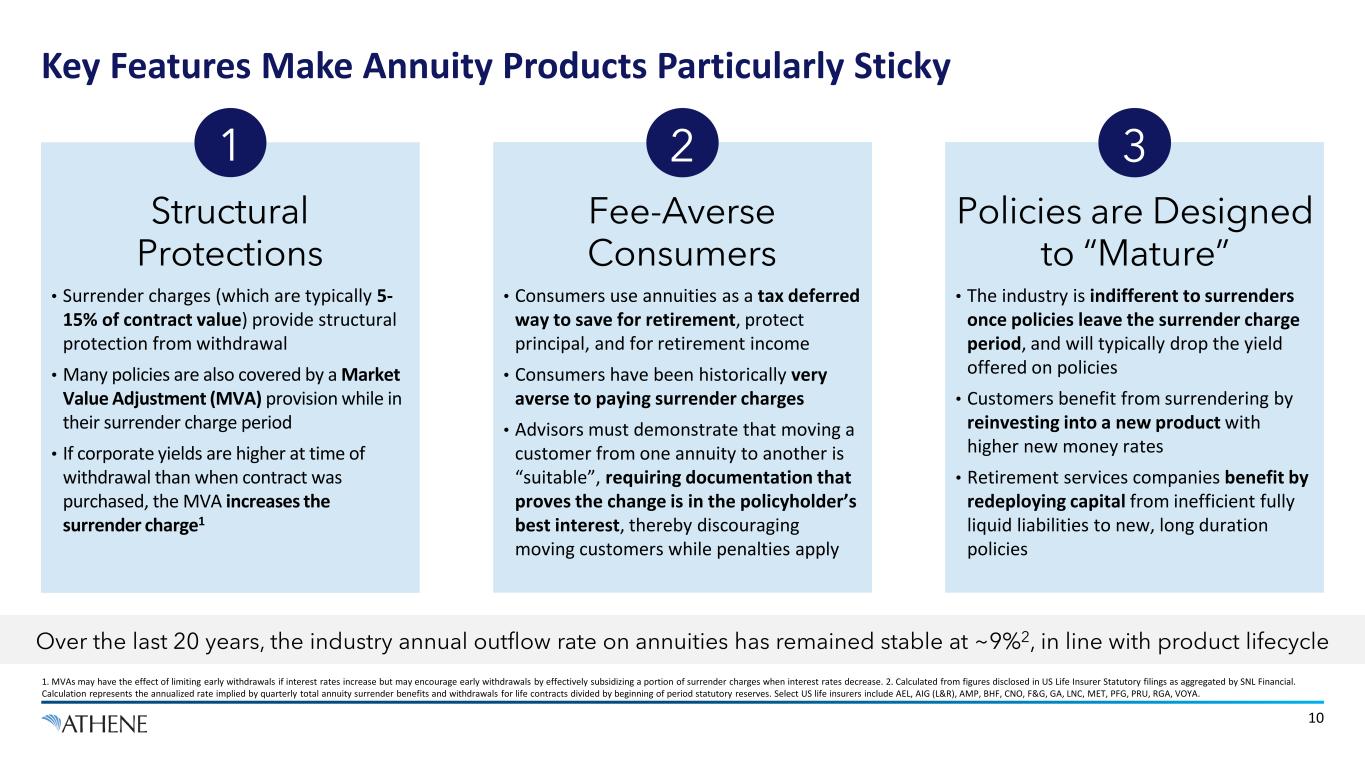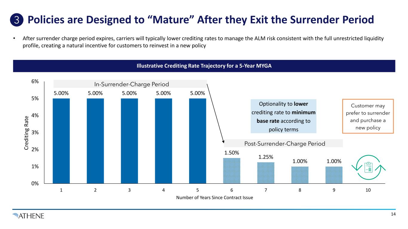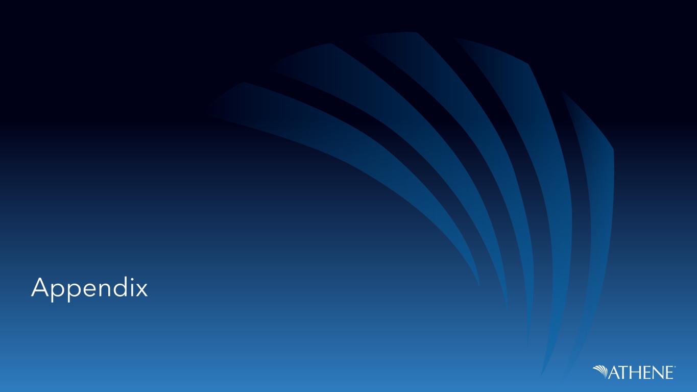$88k $89k $96k $107k $107k $93k $96k $104k $107k $111k $114k $118k $118k $118k 2017 2018 2019 2020 2021 2022 2023 MVA Increases as Interest Rates Rise Low Surrender Value at Inception Total Account Value $118k Less: Surrender Charge (8% of Account Value After 6 Years) ($10k) Less: Market Value Adjustment (A-rated 10yr corporate yield1) ($8k) Less: Bonus Adjustment (Premium bonus1 recaptured upon early surrenders) ($4k) Cash Surrender Value in 2023 (81% of Account Value) $96k Surrender Charges + MVA is a Powerful Combination Note: Example is based on Athene’s Performance Elite 10, issued on 10/25/2017. Assumes $100k initial premium, a 4% premium bonus, and a 1-year S&P 500 strategy with a 3.25% cap. The combination of surrender charges and market value adjustments are capped by standard non-forfeiture law, which sets a floor on the cash surrender value of 87.5% of initial premium, accruing at a minimum valuation rates set in state insurance law. 1. Market value adjustment factor is calculated as 1 + the 10yr A-rated corporate yield at contract issuance divided by 1 + the 10yr A-rated corporate yield at the date of surrender. This is raised to the power of the number of months remaining in the surrender charge period divided by 12. The A-rated corporate yield is based on the Bloomberg 10yr point on the A-rated corporate yield curve. The MVA typically applies to 75% of account value. 1. An annuity bonus adjustment is an additional deposit we add to a policyholders account value at contract inception. If the policyholder keeps the annuity until the surrender charge period expires, the bonus is added to the account value available for withdrawal. 1 Example of Fixed-Indexed Annuity Purchased in 2017 = Total Account Value = Cash Surrender Value 12 Surrender Value Scenario in 2023 • A Market Value Adjustment (MVA) further reduces the cash value a policyholder would receive upon surrender, typically by assuming the liability would be discounted by the current yield on an A-rated 10-year corporate bond