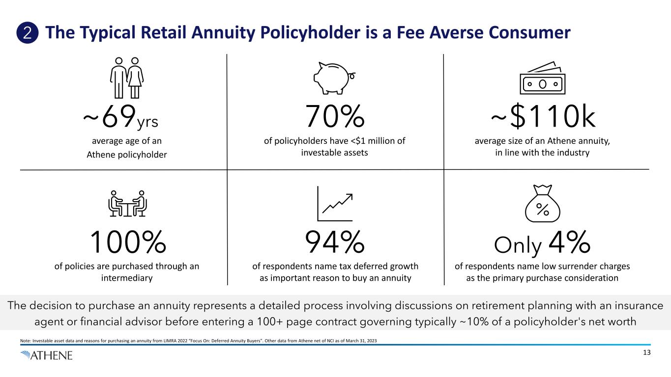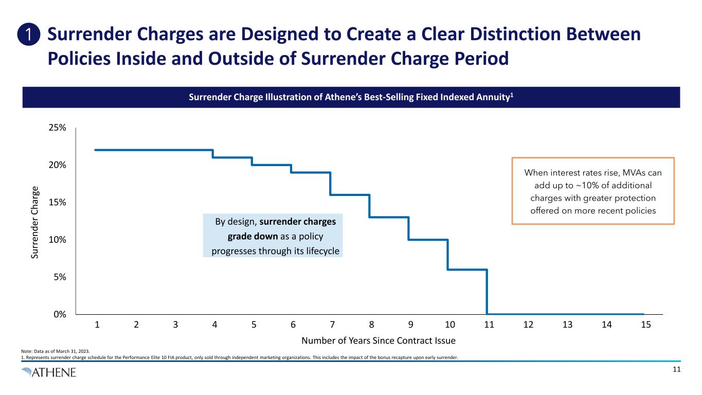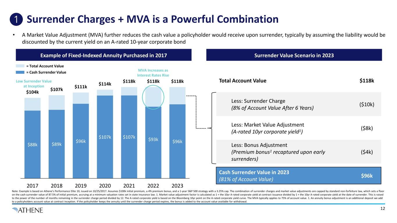 Surrender Charges are Designed to Create a Clear Distinction Between Policies Inside and Outside of Surrender Charge Period Note: Data as of March 31, 2023. 1. Represents surrender charge schedule for the Performance Elite 10 FIA product, only sold through independent marketing organizations. This includes the impact of the bonus recapture upon early surrender. 0% 5% 10% 15% 20% 25% 14-Mar 15-Mar 16-Mar 17-Mar 18-Mar 19-Mar 20-Mar 21-Mar 22-Mar 23-Mar 24-Mar 25-Mar 26-Mar 27-Mar 28-Mar Su rr en de r C ha rg e Number of Years Since Contract Issue When interest rates rise, MVAs can add up to ~10% of additional charges with greater protection offered on more recent policies 2 7 11108 9 12 13 1465431 15 11 By design, surrender charges grade down as a policy progresses through its lifecycle Surrender Charge Illustration of Athene’s Best-Selling Fixed Indexed Annuity1 1