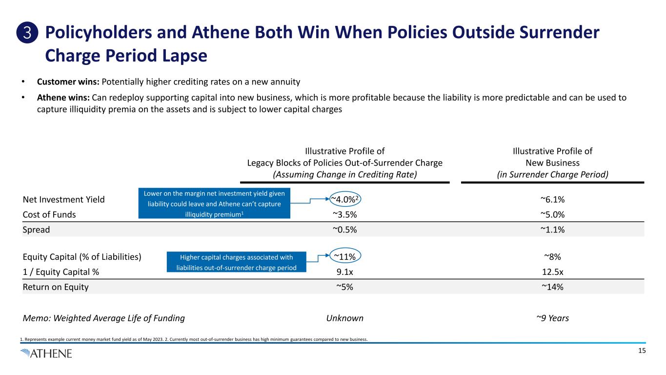 Illustrative Profile of Legacy Blocks of Policies Out-of-Surrender Charge (Assuming Change in Crediting Rate) Illustrative Profile of New Business (in Surrender Charge Period) Net Investment Yield ~4.0%2 ~6.1% Cost of Funds ~3.5% ~5.0% Spread ~0.5% ~1.1% Equity Capital (% of Liabilities) ~11% ~8% 1 / Equity Capital % 9.1x 12.5x Return on Equity ~5% ~14% Memo: Weighted Average Life of Funding Unknown ~9 Years Policyholders and Athene Both Win When Policies Outside Surrender Charge Period Lapse 1. Represents example current money market fund yield as of May 2023. 2. Currently most out-of-surrender business has high minimum guarantees compared to new business. Lower on the margin net investment yield given liability could leave and Athene can’t capture illiquidity premium1 Higher capital charges associated with liabilities out-of-surrender charge period 15 3 • Customer wins: Potentially higher crediting rates on a new annuity • Athene wins: Can redeploy supporting capital into new business, which is more profitable because the liability is more predictable and can be used to capture illiquidity premia on the assets and is subject to lower capital charges