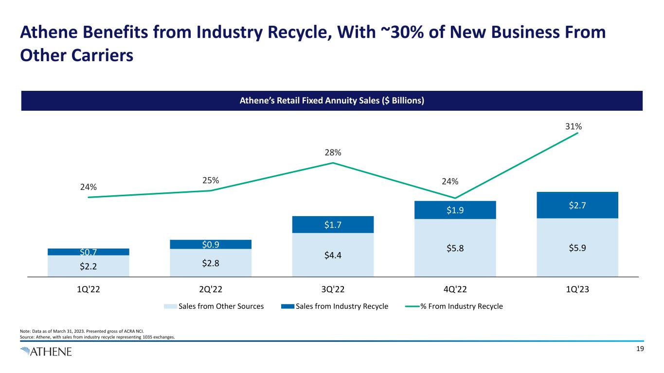 Within the Industry, There Are Relative Winners and Losers from Recycle 1. Data from SNL Financial. Based on total individual general account annuities. Athene total fixed, fixed indexed and payout annuity reserves are gross of ACRA non-controlling interest. 2. LIMRA fixed, fixed-indexed, and fixed immediate annuity sales data. 3. Sales from industry recycle represent 1035 exchanges. 18 100% 94% 89% 6% 11% $1.0T $1.2T $1.4T 2012 2017 2022 100% 95% 91% 5% 9% $72 $108 $210 2012 2017 2022 Athene has #1 Fixed Annuity Market Share Athene’s attractive products and leading market share mean it will capture a disproportionate share of industry recycle ~30% of Athene’s Retail Sales Come From Recycle3 U.S. Retail Fixed Annuities In-Force1 U.S. Fixed Annuity Sales ($B)2 Run-off companies that only fund themselves by means of inorganic growth will only lose from industry recycle = Rest of Fixed Annuity Industry = Athene