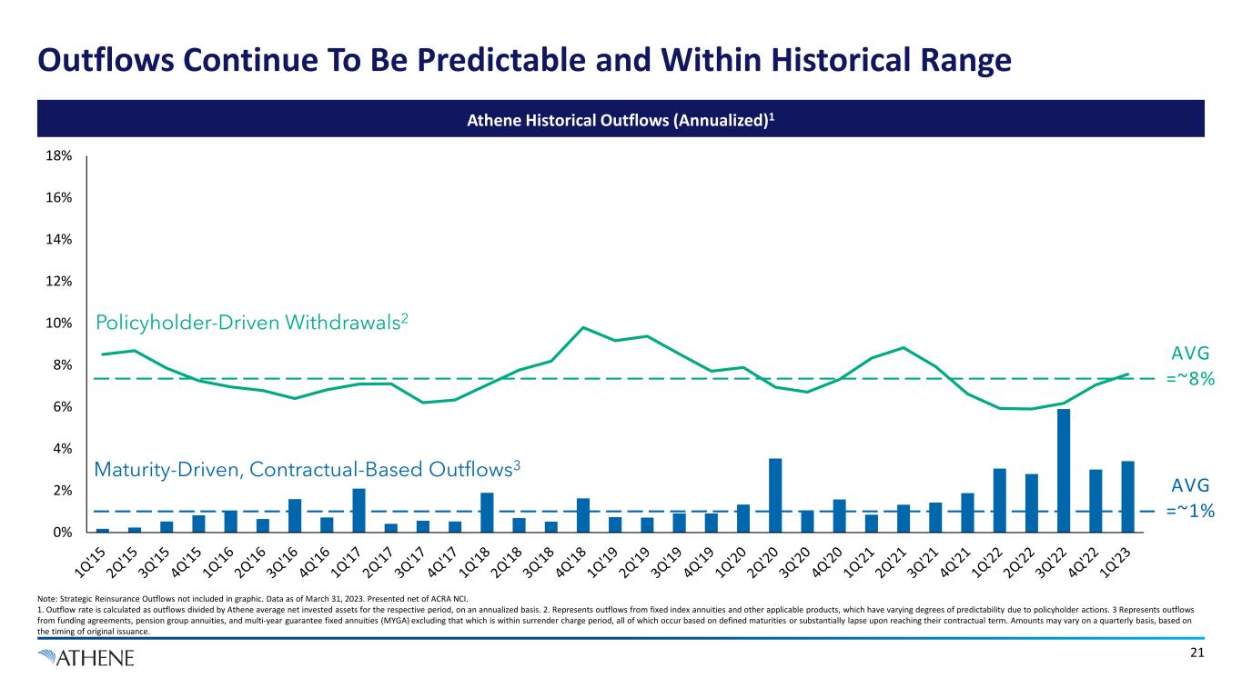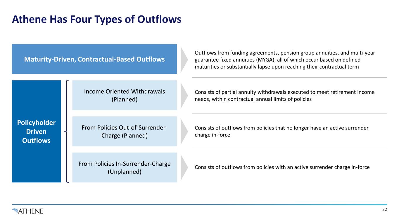0% 2% 4% 6% 8% 10% 12% 14% 16% 18% Outflows Continue To Be Predictable and Within Historical Range Note: Strategic Reinsurance Outflows not included in graphic. Data as of March 31, 2023. Presented net of ACRA NCI. 1. Outflow rate is calculated as outflows divided by Athene average net invested assets for the respective period, on an annualized basis. 2. Represents outflows from fixed index annuities and other applicable products, which have varying degrees of predictability due to policyholder actions. 3 Represents outflows from funding agreements, pension group annuities, and multi-year guarantee fixed annuities (MYGA) excluding that which is within surrender charge period, all of which occur based on defined maturities or substantially lapse upon reaching their contractual term. Amounts may vary on a quarterly basis, based on the timing of original issuance. Athene Historical Outflows (Annualized)1 Policyholder-Driven Withdrawals2 AVG =~8% AVG =~1% Maturity-Driven, Contractual-Based Outflows3 21