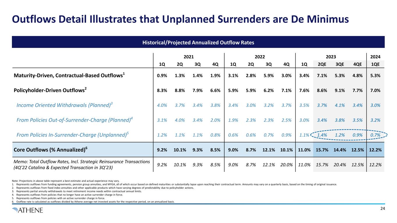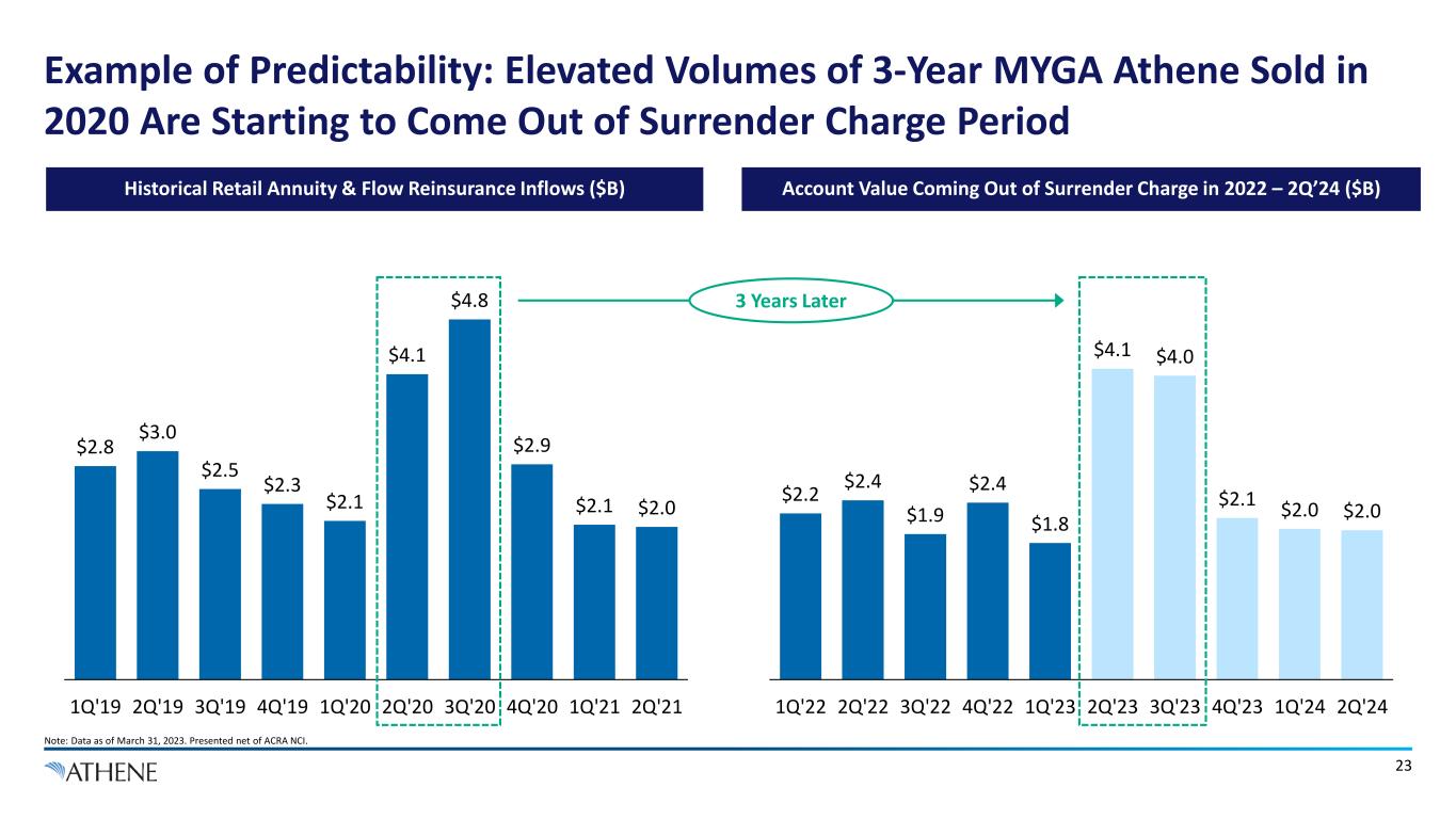 $2.2 $2.4 $1.9 $2.4 $1.8 $4.1 $4.0 $2.1 $2.0 $2.0 1Q'22 2Q'22 3Q'22 4Q'22 1Q'23 2Q'23 3Q'23 4Q'23 1Q'24 2Q'24 Example of Predictability: Elevated Volumes of 3-Year MYGA Athene Sold in 2020 Are Starting to Come Out of Surrender Charge Period Historical Retail Annuity & Flow Reinsurance Inflows ($B) Account Value Coming Out of Surrender Charge in 2022 – 2Q’24 ($B) $2.8 $3.0 $2.5 $2.3 $2.1 $4.1 $4.8 $2.9 $2.1 $2.0 1Q'19 2Q'19 3Q'19 4Q'19 1Q'20 2Q'20 3Q'20 4Q'20 1Q'21 2Q'21 23 3 Years Later Note: Data as of March 31, 2023. Presented net of ACRA NCI.