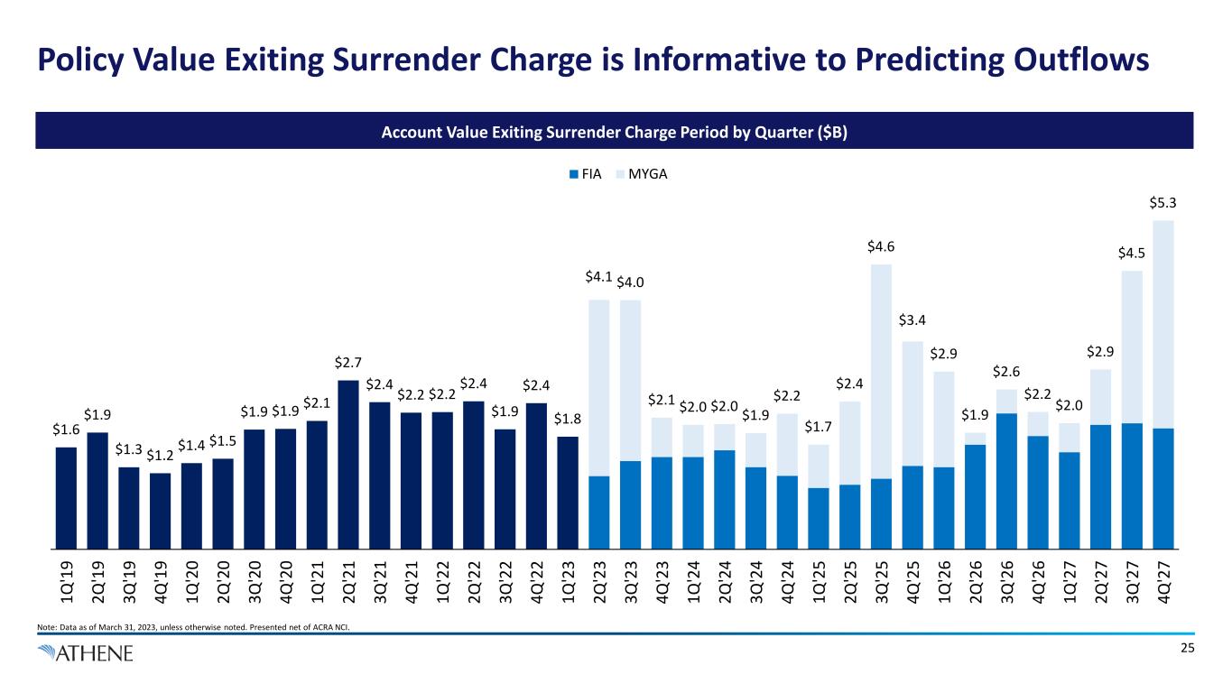 Outflows Detail Illustrates that Unplanned Surrenders are De Minimus Note: Projections in above table represent a best estimate and actual experience may vary. 1. Represents outflows from funding agreements, pension group annuities, and MYGA, all of which occur based on defined maturities or substantially lapse upon reaching their contractual term. Amounts may vary on a quarterly basis, based on the timing of original issuance. 2. Represents outflows from fixed index annuities and other applicable products which have varying degrees of predictability due to policyholder actions. 3. Represents partial annuity withdrawals to meet retirement income needs within contractual annual limits. 4. Represents outflows from policies that no longer have an active surrender charge in force. 5. Represents outflows from policies with an active surrender charge in force. 6. Outflow rate is calculated as outflows divided by Athene average net invested assets for the respective period, on an annualized basis. 24 2021 2022 2023 2024 1Q 2Q 3Q 4Q 1Q 2Q 3Q 4Q 1Q 2QE 3QE 4QE 1QE Maturity-Driven, Contractual-Based Outflows1 0.9% 1.3% 1.4% 1.9% 3.1% 2.8% 5.9% 3.0% 3.4% 7.1% 5.3% 4.8% 5.3% Policyholder-Driven Outflows2 8.3% 8.8% 7.9% 6.6% 5.9% 5.9% 6.2% 7.1% 7.6% 8.6% 9.1% 7.7% 7.0% Income Oriented Withdrawals (Planned)3 4.0% 3.7% 3.4% 3.8% 3.4% 3.0% 3.2% 3.7% 3.5% 3.7% 4.1% 3.4% 3.0% From Policies Out-of-Surrender-Charge (Planned)4 3.1% 4.0% 3.4% 2.0% 1.9% 2.3% 2.3% 2.5% 3.0% 3.4% 3.8% 3.5% 3.2% From Policies In-Surrender-Charge (Unplanned)5 1.2% 1.1% 1.1% 0.8% 0.6% 0.6% 0.7% 0.9% 1.1% 1.4% 1.2% 0.9% 0.7% Core Outflows (% Annualized)6 9.2% 10.1% 9.3% 8.5% 9.0% 8.7% 12.1% 10.1% 11.0% 15.7% 14.4% 12.5% 12.2% Memo: Total Outflow Rates, Incl. Strategic Reinsurance Transactions (4Q’22 Catalina & Expected Transaction in 3Q’23) 9.2% 10.1% 9.3% 8.5% 9.0% 8.7% 12.1% 20.0% 11.0% 15.7% 20.4% 12.5% 12.2% Historical/Projected Annualized Outflow Rates