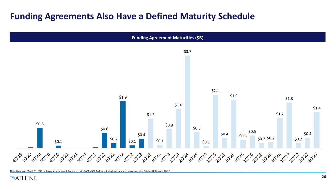Policy Value Exiting Surrender Charge is Informative to Predicting Outflows Account Value Exiting Surrender Charge Period by Quarter ($B) Note: Data as of March 31, 2023, unless otherwise noted. Presented net of ACRA NCI. 25 $1.6 $1.9 $1.3 $1.2 $1.4 $1.5 $1.9 $1.9 $2.1 $2.7 $2.4 $2.2 $2.2 $2.4 $1.9 $2.4 $1.8 $4.1 $4.0 $2.1 $2.0 $2.0 $1.9 $2.2 $1.7 $2.4 $4.6 $3.4 $2.9 $1.9 $2.6 $2.2 $2.0 $2.9 $4.5 $5.3 1Q '1 9 2Q '1 9 3Q '1 9 4Q '1 9 1Q '2 0 2Q '2 0 3Q '2 0 4Q '2 0 1Q '2 1 2Q '2 1 3Q '2 1 4Q '2 1 1Q '2 2 2Q '2 2 3Q '2 2 4Q '2 2 1Q '2 3 2Q '2 3 3Q '2 3 4Q '2 3 1Q '2 4 2Q '2 4 3Q '2 4 4Q '2 4 1Q '2 5 2Q '2 5 3Q '2 5 4Q '2 5 1Q '2 6 2Q '2 6 3Q '2 6 4Q '2 6 1Q '2 7 2Q '2 7 3Q '2 7 4Q '2 7 FIA MYGA