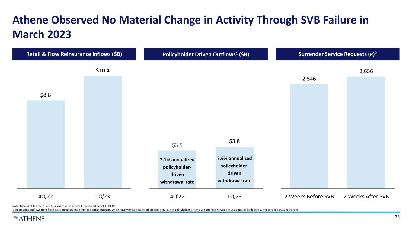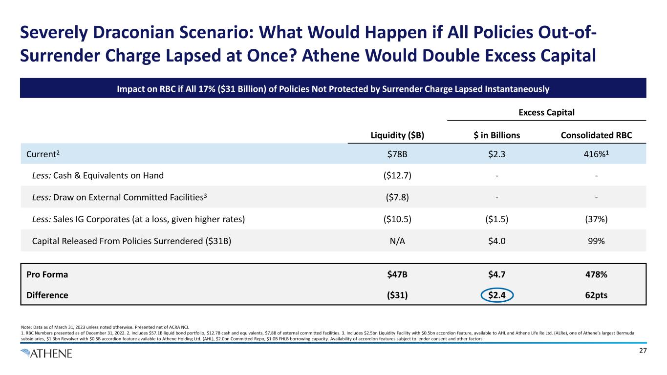 Severely Draconian Scenario: What Would Happen if All Policies Out-of- Surrender Charge Lapsed at Once? Athene Would Double Excess Capital Note: Data as of March 31, 2023 unless noted otherwise. Presented net of ACRA NCI. 1. RBC Numbers presented as of December 31, 2022. 2. Includes $57.1B liquid bond portfolio, $12.7B cash and equivalents, $7.8B of external committed facilities. 3. Includes $2.5bn Liquidity Facility with $0.5bn accordion feature, available to AHL and Athene Life Re Ltd. (ALRe), one of Athene’s largest Bermuda subsidiaries, $1.3bn Revolver with $0.5B accordion feature available to Athene Holding Ltd. (AHL), $2.0bn Committed Repo, $1.0B FHLB borrowing capacity. Availability of accordion features subject to lender consent and other factors. Excess Capital Liquidity ($B) $ in Billions Consolidated RBC Current2 $78B $2.3 416%1 Less: Cash & Equivalents on Hand ($12.7) - - Less: Draw on External Committed Facilities3 ($7.8) - - Less: Sales IG Corporates (at a loss, given higher rates) ($10.5) ($1.5) (37%) Capital Released From Policies Surrendered ($31B) N/A $4.0 99% Pro Forma $47B $4.7 478% Difference ($31) $2.4 62pts Impact on RBC if All 17% ($31 Billion) of Policies Not Protected by Surrender Charge Lapsed Instantaneously 27