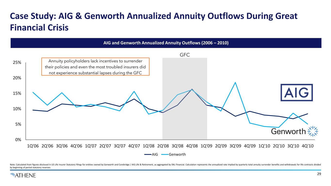Case Study: AIG & Genworth Annualized Annuity Outflows During Great Financial Crisis Note: Calculated from figures disclosed in US Life Insurer Statutory filings for entities owned by Genworth and Corebridge / AIG Life & Retirement, as aggregated by SNL Financial. Calculation represents the annualized rate implied by quarterly total annuity surrender benefits and withdrawals for life contracts divided by beginning of period statutory reserves. 0% 5% 10% 15% 20% 25% 1Q'06 2Q'06 3Q'06 4Q'06 1Q'07 2Q'07 3Q'07 4Q'07 1Q'08 2Q'08 3Q'08 4Q'08 1Q'09 2Q'09 3Q'09 4Q'09 1Q'10 2Q'10 3Q'10 4Q'10 AIG Genworth AIG and Genworth Annualized Annuity Outflows (2006 – 2010) Annuity policyholders lack incentives to surrender their policies and even the most troubled insurers did not experience substantial lapses during the GFC GFC 29