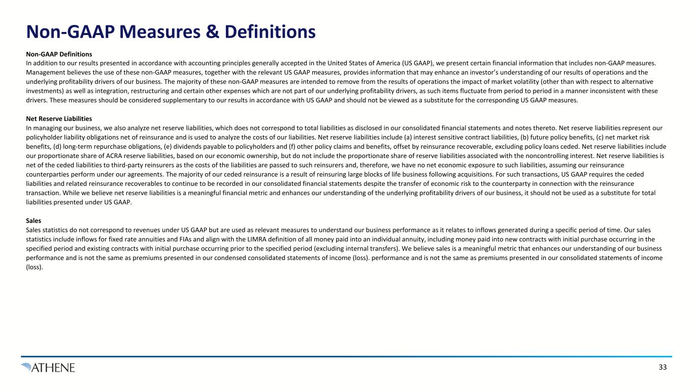 33 Non-GAAP Measures & Definitions Non-GAAP Definitions In addition to our results presented in accordance with accounting principles generally accepted in the United States of America (US GAAP), we present certain financial information that includes non-GAAP measures. Management believes the use of these non-GAAP measures, together with the relevant US GAAP measures, provides information that may enhance an investor’s understanding of our results of operations and the underlying profitability drivers of our business. The majority of these non-GAAP measures are intended to remove from the results of operations the impact of market volatility (other than with respect to alternative investments) as well as integration, restructuring and certain other expenses which are not part of our underlying profitability drivers, as such items fluctuate from period to period in a manner inconsistent with these drivers. These measures should be considered supplementary to our results in accordance with US GAAP and should not be viewed as a substitute for the corresponding US GAAP measures. Net Reserve Liabilities In managing our business, we also analyze net reserve liabilities, which does not correspond to total liabilities as disclosed in our consolidated financial statements and notes thereto. Net reserve liabilities represent our policyholder liability obligations net of reinsurance and is used to analyze the costs of our liabilities. Net reserve liabilities include (a) interest sensitive contract liabilities, (b) future policy benefits, (c) net market risk benefits, (d) long-term repurchase obligations, (e) dividends payable to policyholders and (f) other policy claims and benefits, offset by reinsurance recoverable, excluding policy loans ceded. Net reserve liabilities include our proportionate share of ACRA reserve liabilities, based on our economic ownership, but do not include the proportionate share of reserve liabilities associated with the noncontrolling interest. Net reserve liabilities is net of the ceded liabilities to third-party reinsurers as the costs of the liabilities are passed to such reinsurers and, therefore, we have no net economic exposure to such liabilities, assuming our reinsurance counterparties perform under our agreements. The majority of our ceded reinsurance is a result of reinsuring large blocks of life business following acquisitions. For such transactions, US GAAP requires the ceded liabilities and related reinsurance recoverables to continue to be recorded in our consolidated financial statements despite the transfer of economic risk to the counterparty in connection with the reinsurance transaction. While we believe net reserve liabilities is a meaningful financial metric and enhances our understanding of the underlying profitability drivers of our business, it should not be used as a substitute for total liabilities presented under US GAAP. Sales Sales statistics do not correspond to revenues under US GAAP but are used as relevant measures to understand our business performance as it relates to inflows generated during a specific period of time. Our sales statistics include inflows for fixed rate annuities and FIAs and align with the LIMRA definition of all money paid into an individual annuity, including money paid into new contracts with initial purchase occurring in the specified period and existing contracts with initial purchase occurring prior to the specified period (excluding internal transfers). We believe sales is a meaningful metric that enhances our understanding of our business performance and is not the same as premiums presented in our condensed consolidated statements of income (loss). performance and is not the same as premiums presented in our consolidated statements of income (loss).