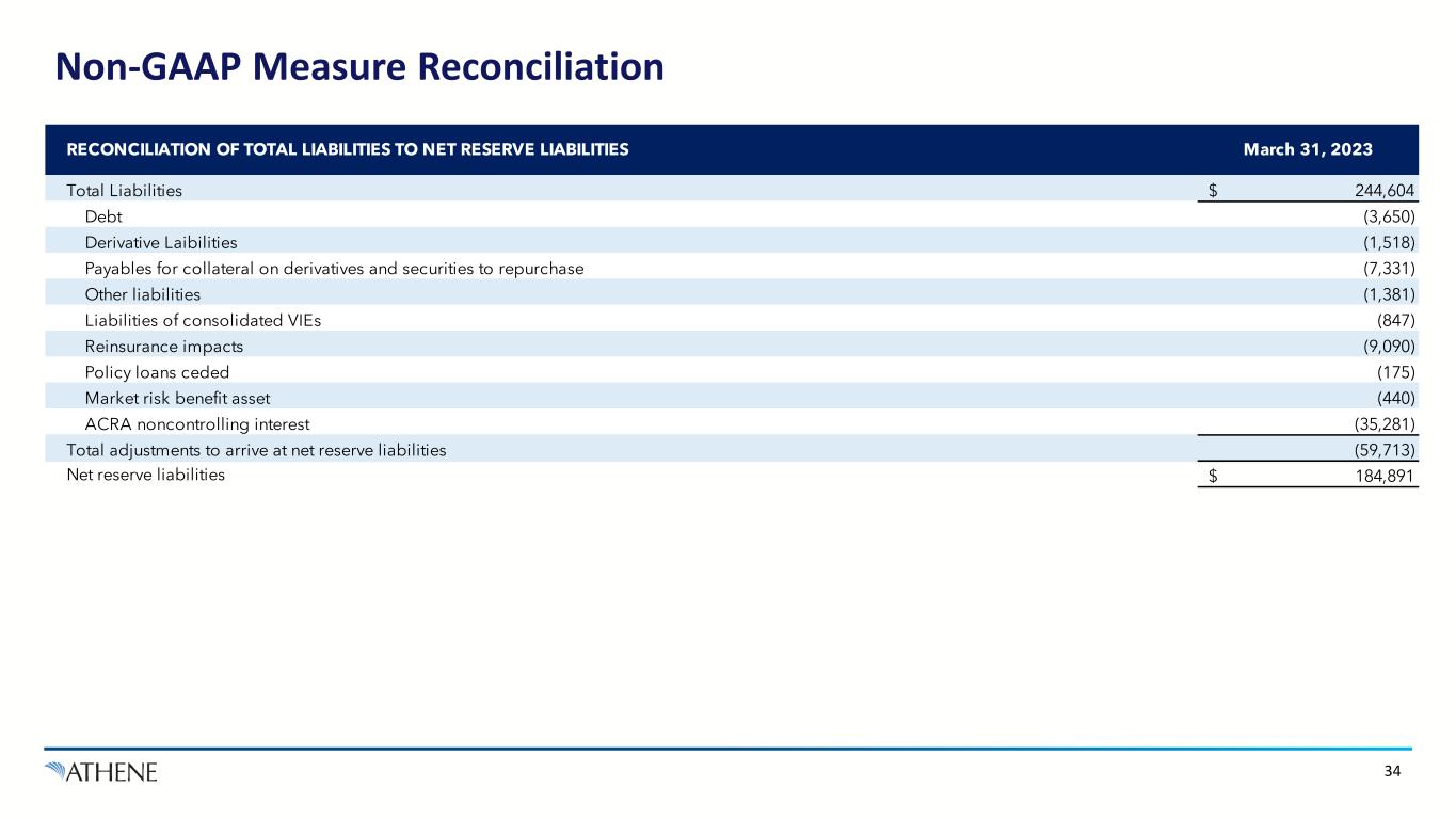 34 Non-GAAP Measure Reconciliation Total Liabilities Debt Derivative Laibilities Payables for collateral on derivatives and securities to repurchase Other liabilities Liabilities of consolidated VIEs Reinsurance impacts Policy loans ceded Market risk benefit asset ACRA noncontrolling interest Total adjustments to arrive at net reserve liabilities Net reserve liabilities $ 184,891 (440) (35,281) (59,713) (175) RECONCILIATION OF TOTAL LIABILITIES TO NET RESERVE LIABILITIES March 31, 2023 $ 244,604 (3,650) (1,518) (7,331) (1,381) (847) (9,090)