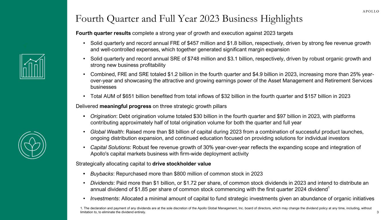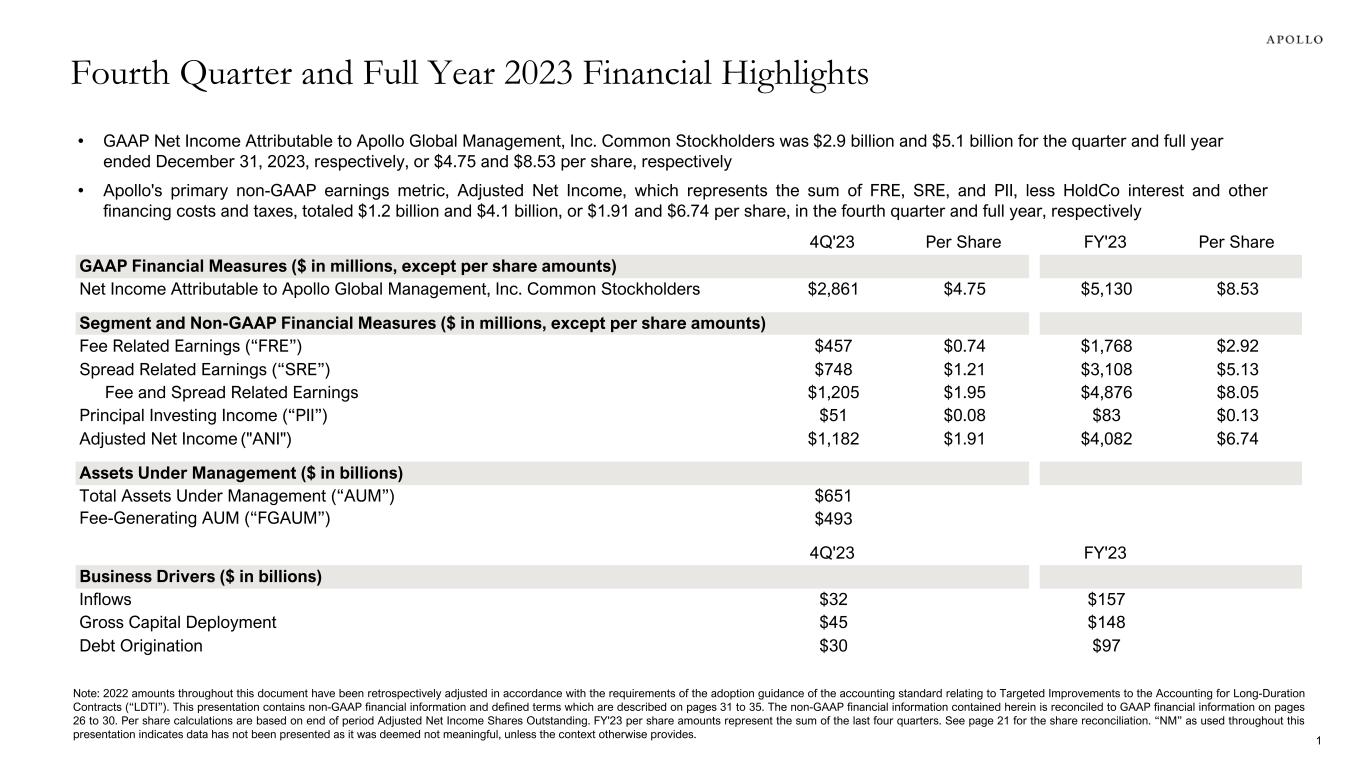 4Q'23 Per Share FY'23 Per Share GAAP Financial Measures ($ in millions, except per share amounts) Net Income Attributable to Apollo Global Management, Inc. Common Stockholders $2,861 $4.75 $5,130 $8.53 Segment and Non-GAAP Financial Measures ($ in millions, except per share amounts) Fee Related Earnings (“FRE”) $457 $0.74 $1,768 $2.92 Spread Related Earnings (“SRE”) $748 $1.21 $3,108 $5.13 Fee and Spread Related Earnings $1,205 $1.95 $4,876 $8.05 Principal Investing Income (“PII”) $51 $0.08 $83 $0.13 Adjusted Net Income ("ANI") $1,182 $1.91 $4,082 $6.74 Assets Under Management ($ in billions) Total Assets Under Management (“AUM”) $651 Fee-Generating AUM (“FGAUM”) $493 4Q'23 FY'23 Business Drivers ($ in billions) Inflows $32 $157 Gross Capital Deployment $45 $148 Debt Origination $30 $97 Fourth Quarter and Full Year 2023 Financial Highlights • GAAP Net Income Attributable to Apollo Global Management, Inc. Common Stockholders was $2.9 billion and $5.1 billion for the quarter and full year ended December 31, 2023, respectively, or $4.75 and $8.53 per share, respectively • Apollo's primary non-GAAP earnings metric, Adjusted Net Income, which represents the sum of FRE, SRE, and PII, less HoldCo interest and other financing costs and taxes, totaled $1.2 billion and $4.1 billion, or $1.91 and $6.74 per share, in the fourth quarter and full year, respectively Note: 2022 amounts throughout this document have been retrospectively adjusted in accordance with the requirements of the adoption guidance of the accounting standard relating to Targeted Improvements to the Accounting for Long-Duration Contracts (“LDTI”). This presentation contains non-GAAP financial information and defined terms which are described on pages 31 to 35. The non-GAAP financial information contained herein is reconciled to GAAP financial information on pages 26 to 30. Per share calculations are based on end of period Adjusted Net Income Shares Outstanding. FY'23 per share amounts represent the sum of the last four quarters. See page 21 for the share reconciliation. “NM” as used throughout this presentation indicates data has not been presented as it was deemed not meaningful, unless the context otherwise provides. 1