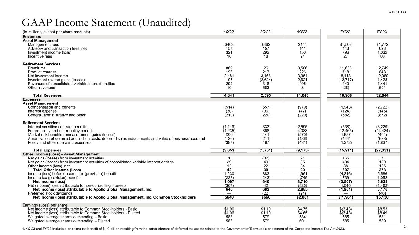 (In millions, except per share amounts) 4Q'22 3Q'23 4Q'23 FY'22 FY'23 Revenues     Asset Management     Management fees $403 $462 $444 $1,503 $1,772 Advisory and transaction fees, net 157 157 141 443 623 Investment income (loss) 321 292 150 796 1,032 Incentive fees 10 18 21 27 80   Retirement Services     Premiums 869 26 3,586 11,638 12,749 Product charges 193 217 226 718 848 Net investment income 2,481 3,166 3,354 8,148 12,080 Investment related gains (losses) 105 (2,624) 2,621 (12,717) 1,428 Revenues of consolidated variable interest entities 292 318 495 440 1,441 Other revenues 10 563 8 (28) 591   Total Revenues 4,841 2,595 11,046 10,968 32,644 Expenses Asset Management     Compensation and benefits (514) (557) (979) (1,943) (2,722) Interest expense (30) (36) (47) (124) (145) General, administrative and other (210) (220) (229) (682) (872)   Retirement Services     Interest sensitive contract benefits (1,119) (333) (2,595) (538) (6,229) Future policy and other policy benefits (1,235) (368) (4,088) (12,465) (14,434) Market risk benefits remeasurement gains (losses) (32) 441 (570) 1,657 (404) Amortization of deferred acquisition costs, deferred sales inducements and value of business acquired (126) (211) (186) (444) (688) Policy and other operating expenses (387) (467) (481) (1,372) (1,837)   Total Expenses (3,653) (1,751) (9,175) (15,911) (27,331) Other Income (Loss) – Asset Management Net gains (losses) from investment activities 1 (32) 21 165 7 Net gains (losses) from investment activities of consolidated variable interest entities 29 49 35 494 130 Other income (loss), net 12 22 34 38 136 Total Other Income (Loss) 42 39 90 697 273 Income (loss) before income tax (provision) benefit 1,230 883 1,961 (4,246) 5,586 Income tax (provision) benefit1 (223) (243) 1,749 739 1,052 Net income (loss) 1,007 640 3,710 (3,507) 6,638 Net (income) loss attributable to non-controlling interests (367) 42 (825) 1,546 (1,462) Net income (loss) attributable to Apollo Global Management, Inc. 640 682 2,885 (1,961) 5,176 Preferred stock dividends — (22) (24) — (46) Net income (loss) attributable to Apollo Global Management, Inc. Common Stockholders $640 $660 $2,861 $(1,961) $5,130       Earnings (Loss) per share Net income (loss) attributable to Common Stockholders - Basic $1.06 $1.10 $4.75 $(3.43) $8.53 Net income (loss) attributable to Common Stockholders - Diluted $1.06 $1.10 $4.65 $(3.43) $8.49 Weighted average shares outstanding – Basic 583 579 584 585 581 Weighted average shares outstanding – Diluted 583 579 601 585 589 GAAP Income Statement (Unaudited) 2 1. 4Q'23 and FY'23 include a one-time tax benefit of $1.9 billion resulting from the establishment of deferred tax assets related to the Government of Bermuda's enactment of the Corporate Income Tax Act 2023.