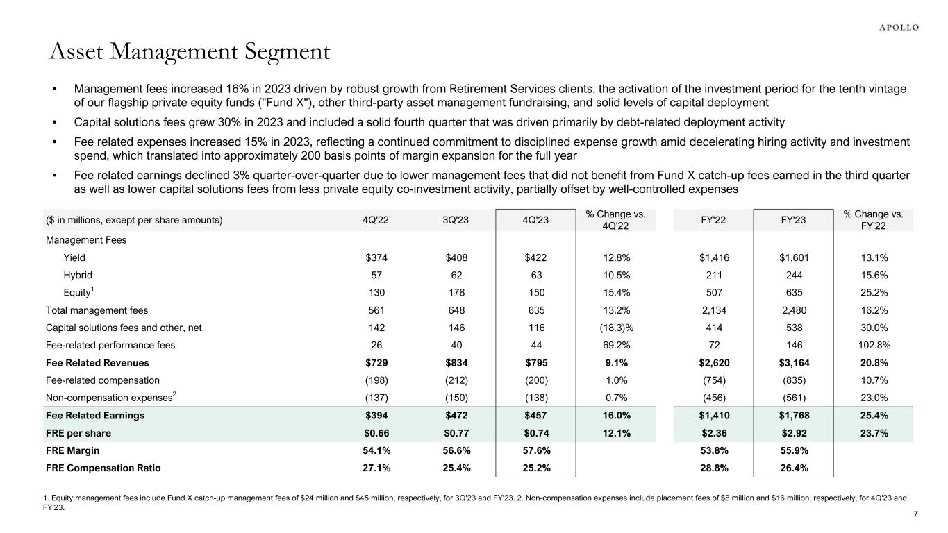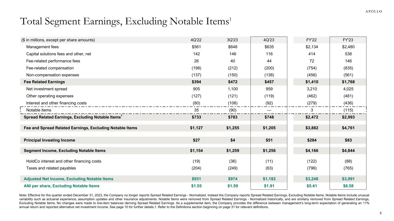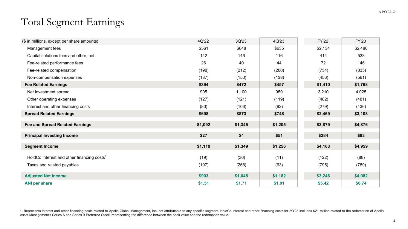 ($ in millions, except per share amounts) 4Q'22 3Q'23 4Q'23 FY'22 FY'23 Management fees $561 $648 $635 $2,134 $2,480 Capital solutions fees and other, net 142 146 116 414 538 Fee-related performance fees 26 40 44 72 146 Fee-related compensation (198) (212) (200) (754) (835) Non-compensation expenses (137) (150) (138) (456) (561) Fee Related Earnings $394 $472 $457 $1,410 $1,768 Net investment spread 905 1,100 959 3,210 4,025 Other operating expenses (127) (121) (119) (462) (481) Interest and other financing costs (80) (106) (92) (279) (436) Spread Related Earnings $698 $873 $748 $2,469 $3,108 Fee and Spread Related Earnings $1,092 $1,345 $1,205 $3,879 $4,876 Principal Investing Income $27 $4 $51 $284 $83 Segment Income $1,119 $1,349 $1,256 $4,163 $4,959 HoldCo interest and other financing costs1 (19) (36) (11) (122) (88) Taxes and related payables (197) (268) (63) (795) (789) Adjusted Net Income $903 $1,045 $1,182 $3,246 $4,082 ANI per share $1.51 $1.71 $1.91 $5.42 $6.74 1. Represents interest and other financing costs related to Apollo Global Management, Inc. not attributable to any specific segment. HoldCo interest and other financing costs for 3Q'23 includes $21 million related to the redemption of Apollo Asset Management's Series A and Series B Preferred Stock, representing the difference between the book value and the redemption value. Total Segment Earnings 4