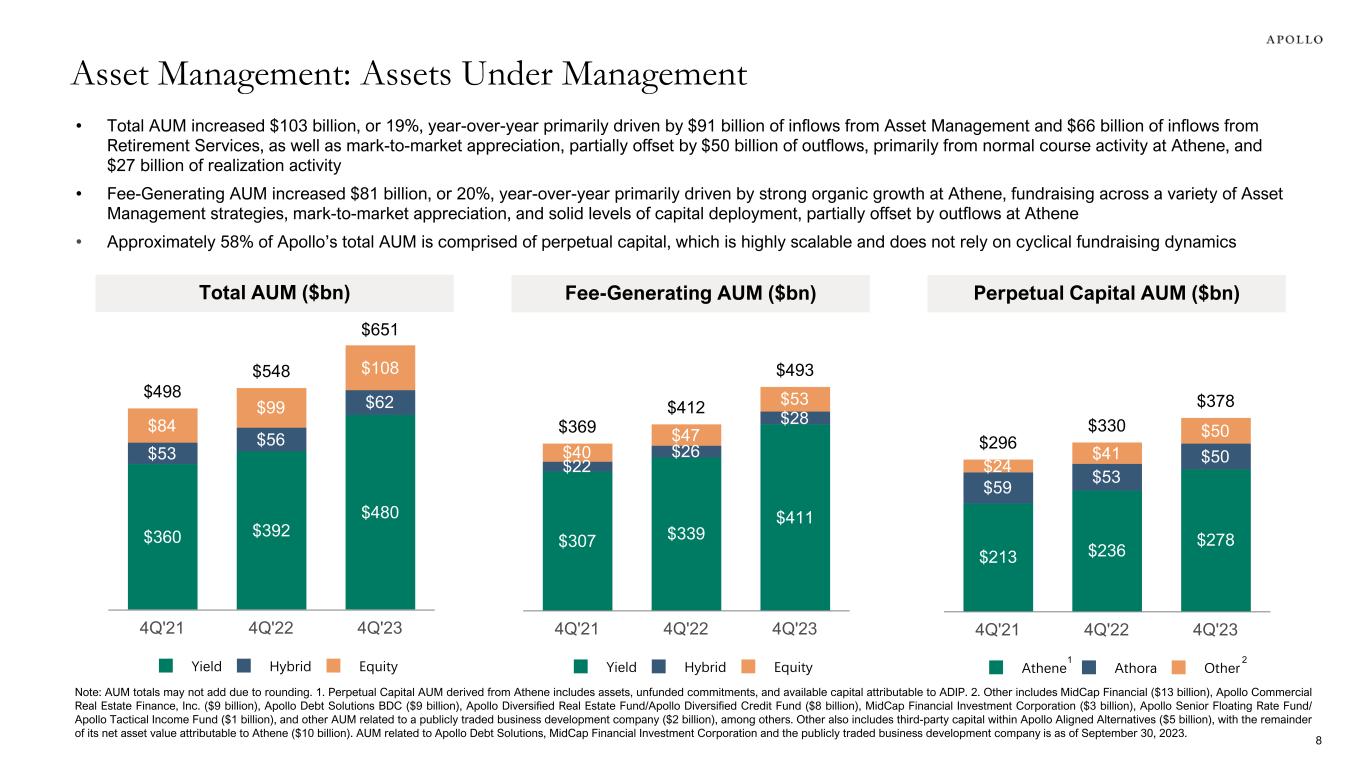• Management fees increased 16% in 2023 driven by robust growth from Retirement Services clients, the activation of the investment period for the tenth vintage of our flagship private equity funds ("Fund X"), other third-party asset management fundraising, and solid levels of capital deployment • Capital solutions fees grew 30% in 2023 and included a solid fourth quarter that was driven primarily by debt-related deployment activity • Fee related expenses increased 15% in 2023, reflecting a continued commitment to disciplined expense growth amid decelerating hiring activity and investment spend, which translated into approximately 200 basis points of margin expansion for the full year • Fee related earnings declined 3% quarter-over-quarter due to lower management fees that did not benefit from Fund X catch-up fees earned in the third quarter as well as lower capital solutions fees from less private equity co-investment activity, partially offset by well-controlled expenses ($ in millions, except per share amounts) 4Q'22 3Q'23 4Q'23 % Change vs. 4Q'22 FY'22 FY'23 % Change vs. FY'22 Management Fees Yield $374 $408 $422 12.8% $1,416 $1,601 13.1% Hybrid 57 62 63 10.5% 211 244 15.6% Equity1 130 178 150 15.4% 507 635 25.2% Total management fees 561 648 635 13.2% 2,134 2,480 16.2% Capital solutions fees and other, net 142 146 116 (18.3)% 414 538 30.0% Fee-related performance fees 26 40 44 69.2% 72 146 102.8% Fee Related Revenues $729 $834 $795 9.1% $2,620 $3,164 20.8% Fee-related compensation (198) (212) (200) 1.0% (754) (835) 10.7% Non-compensation expenses2 (137) (150) (138) 0.7% (456) (561) 23.0% Fee Related Earnings $394 $472 $457 16.0% $1,410 $1,768 25.4% FRE per share $0.66 $0.77 $0.74 12.1% $2.36 $2.92 23.7% FRE Margin 54.1% 56.6% 57.6% 53.8% 55.9% FRE Compensation Ratio 27.1% 25.4% 25.2% 28.8% 26.4% Asset Management Segment 1. Equity management fees include Fund X catch-up management fees of $24 million and $45 million, respectively, for 3Q'23 and FY'23. 2. Non-compensation expenses include placement fees of $8 million and $16 million, respectively, for 4Q'23 and FY'23. 7