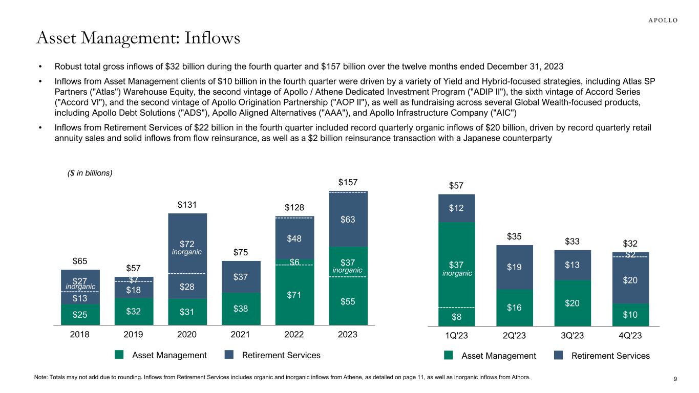• Total AUM increased $103 billion, or 19%, year-over-year primarily driven by $91 billion of inflows from Asset Management and $66 billion of inflows from Retirement Services, as well as mark-to-market appreciation, partially offset by $50 billion of outflows, primarily from normal course activity at Athene, and $27 billion of realization activity • Fee-Generating AUM increased $81 billion, or 20%, year-over-year primarily driven by strong organic growth at Athene, fundraising across a variety of Asset Management strategies, mark-to-market appreciation, and solid levels of capital deployment, partially offset by outflows at Athene • Approximately 58% of Apollo’s total AUM is comprised of perpetual capital, which is highly scalable and does not rely on cyclical fundraising dynamics Total AUM ($bn) Fee-Generating AUM ($bn) $498 $548 $651 $360 $392 $480 $53 $56 $62 $84 $99 $108 Yield Hybrid Equity 4Q'21 4Q'22 4Q'23 $369 $412 $493 $307 $339 $411 $22 $26 $28 $40 $47 $53 Yield Hybrid Equity 4Q'21 4Q'22 4Q'23 Perpetual Capital AUM ($bn) $296 $330 $378 $213 $236 $278 $59 $53 $50$24 $41 $50 Athene Athora Other 4Q'21 4Q'22 4Q'23 8 Asset Management: Assets Under Management Note: AUM totals may not add due to rounding. 1. Perpetual Capital AUM derived from Athene includes assets, unfunded commitments, and available capital attributable to ADIP. 2. Other includes MidCap Financial ($13 billion), Apollo Commercial Real Estate Finance, Inc. ($9 billion), Apollo Debt Solutions BDC ($9 billion), Apollo Diversified Real Estate Fund/Apollo Diversified Credit Fund ($8 billion), MidCap Financial Investment Corporation ($3 billion), Apollo Senior Floating Rate Fund/ Apollo Tactical Income Fund ($1 billion), and other AUM related to a publicly traded business development company ($2 billion), among others. Other also includes third-party capital within Apollo Aligned Alternatives ($5 billion), with the remainder of its net asset value attributable to Athene ($10 billion). AUM related to Apollo Debt Solutions, MidCap Financial Investment Corporation and the publicly traded business development company is as of September 30, 2023. 21