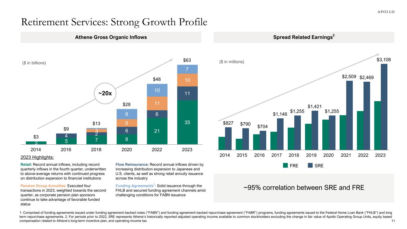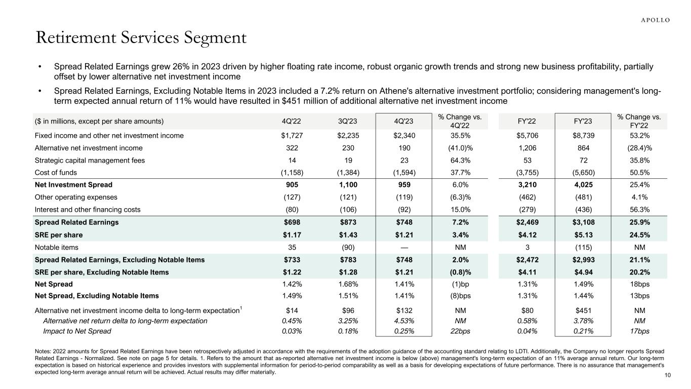 • Spread Related Earnings grew 26% in 2023 driven by higher floating rate income, robust organic growth trends and strong new business profitability, partially offset by lower alternative net investment income • Spread Related Earnings, Excluding Notable Items in 2023 included a 7.2% return on Athene's alternative investment portfolio; considering management's long- term expected annual return of 11% would have resulted in $451 million of additional alternative net investment income Notes: 2022 amounts for Spread Related Earnings have been retrospectively adjusted in accordance with the requirements of the adoption guidance of the accounting standard relating to LDTI. Additionally, the Company no longer reports Spread Related Earnings - Normalized. See note on page 5 for details. 1. Refers to the amount that as-reported alternative net investment income is below (above) management's long-term expectation of an 11% average annual return. Our long-term expectation is based on historical experience and provides investors with supplemental information for period-to-period comparability as well as a basis for developing expectations of future performance. There is no assurance that management's expected long-term average annual return will be achieved. Actual results may differ materially. ($ in millions, except per share amounts) 4Q'22 3Q'23 4Q'23 % Change vs. 4Q'22 FY'22 FY'23 % Change vs. FY'22 Fixed income and other net investment income $1,727 $2,235 $2,340 35.5% $5,706 $8,739 53.2% Alternative net investment income 322 230 190 (41.0)% 1,206 864 (28.4)% Strategic capital management fees 14 19 23 64.3% 53 72 35.8% Cost of funds (1,158) (1,384) (1,594) 37.7% (3,755) (5,650) 50.5% Net Investment Spread 905 1,100 959 6.0% 3,210 4,025 25.4% Other operating expenses (127) (121) (119) (6.3)% (462) (481) 4.1% Interest and other financing costs (80) (106) (92) 15.0% (279) (436) 56.3% Spread Related Earnings $698 $873 $748 7.2% $2,469 $3,108 25.9% SRE per share $1.17 $1.43 $1.21 3.4% $4.12 $5.13 24.5% Notable items 35 (90) — NM 3 (115) NM Spread Related Earnings, Excluding Notable Items $733 $783 $748 2.0% $2,472 $2,993 21.1% SRE per share, Excluding Notable Items $1.22 $1.28 $1.21 (0.8)% $4.11 $4.94 20.2% Net Spread 1.42% 1.68% 1.41% (1)bp 1.31% 1.49% 18bps Net Spread, Excluding Notable Items 1.49% 1.51% 1.41% (8)bps 1.31% 1.44% 13bps Alternative net investment income delta to long-term expectation1 $14 $96 $132 NM $80 $451 NM Alternative net return delta to long-term expectation 0.45% 3.25% 4.53% NM 0.58% 3.78% NM Impact to Net Spread 0.03% 0.18% 0.25% 22bps 0.04% 0.21% 17bps Retirement Services Segment 10