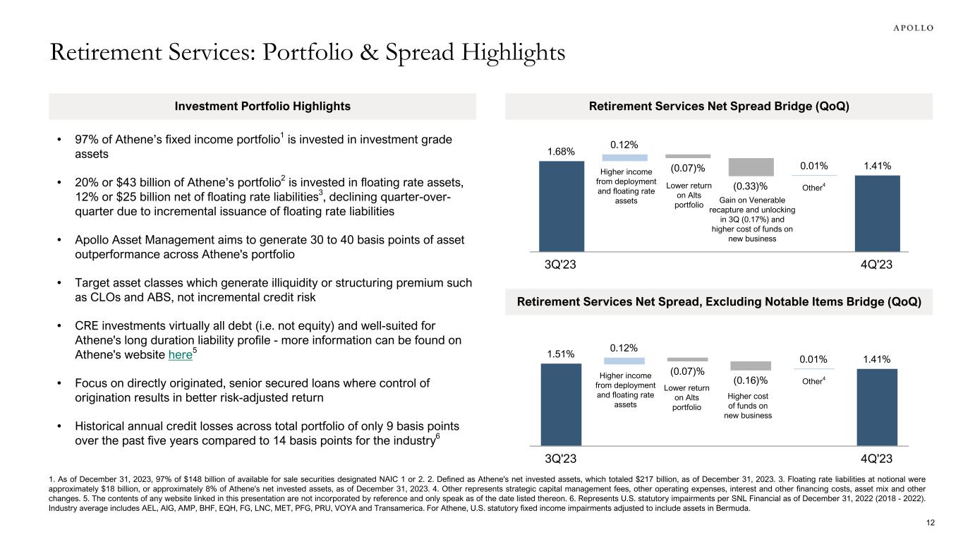 $3 $9 $13 $28 $48 $63 3 5 7 8 21 35 4 2 6 6 11 3 6 11 10 8 10 7 2014 2016 2018 2020 2022 2023 1. Comprised of funding agreements issued under funding agreement backed notes (“FABN”) and funding agreement backed repurchase agreement (“FABR”) programs, funding agreements issued to the Federal Home Loan Bank (“FHLB”) and long term repurchase agreements. 2. For periods prior to 2022, SRE represents Athene’s historically reported adjusted operating income available to common stockholders excluding the change in fair value of Apollo Operating Group Units, equity based compensation related to Athene’s long-term incentive plan, and operating income tax. Retirement Services: Strong Growth Profile Athene Gross Organic Inflows Spread Related Earnings2 ~20x ($ in billions) ~95% correlation between SRE and FRE 11 ($ in millions) 2023 Highlights: Retail: Record annual inflows, including record quarterly inflows in the fourth quarter, underwritten to above-average returns with continued progress on distribution expansion to financial institutions Flow Reinsurance: Record annual inflows driven by increasing distribution expansion to Japanese and U.S. clients, as well as strong retail annuity issuance across the industry Pension Group Annuities: Executed four transactions in 2023, weighted towards the second quarter, as corporate pension plan sponsors continue to take advantage of favorable funded status Funding Agreements1: Solid issuance through the FHLB and secured funding agreement channels amid challenging conditions for FABN issuance $827 $790 $704 $1,148 $1,255 $1,421 $1,255 $2,509 $2,469 $3,108 FRE SRE 2014 2015 2016 2017 2018 2019 2020 2021 2022 2023