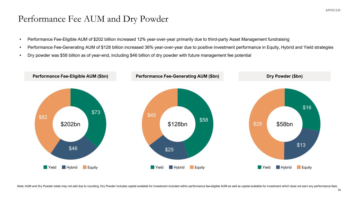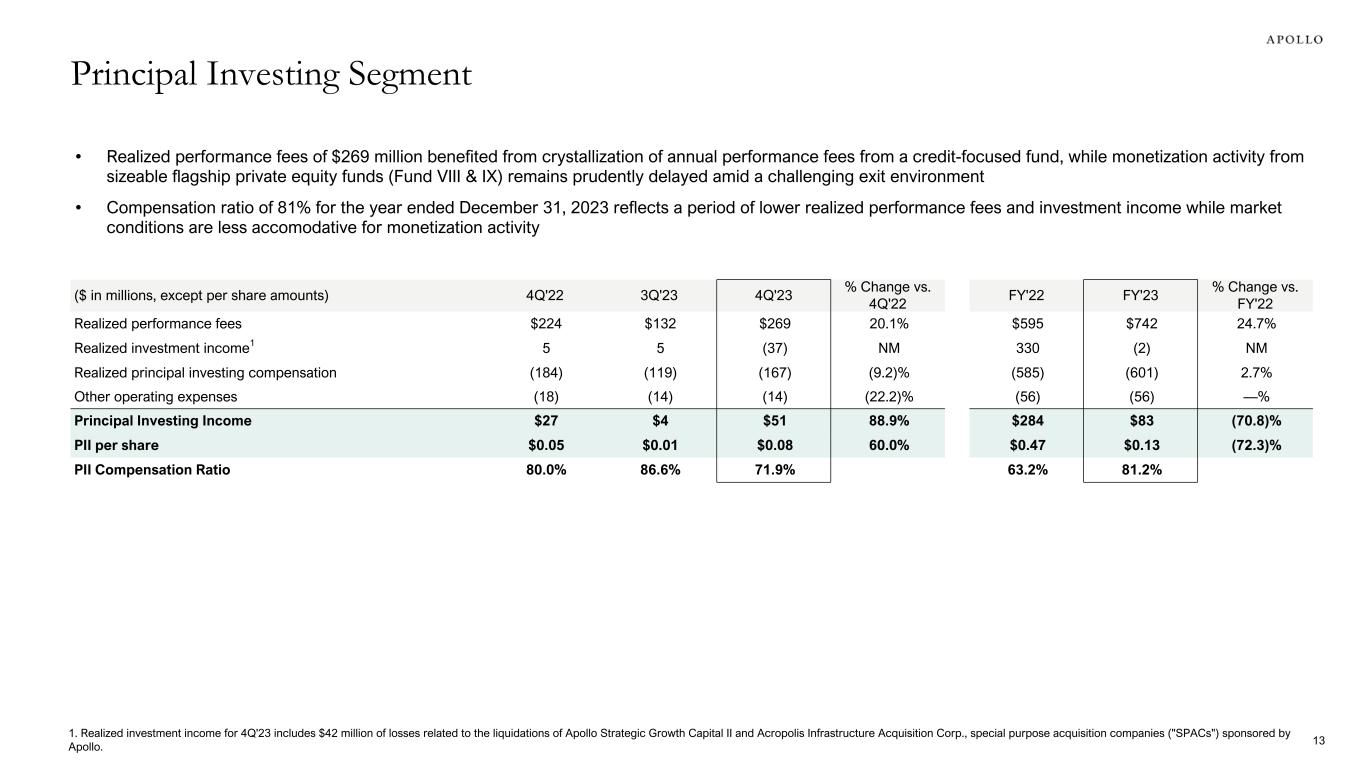 1. Realized investment income for 4Q'23 includes $42 million of losses related to the liquidations of Apollo Strategic Growth Capital II and Acropolis Infrastructure Acquisition Corp., special purpose acquisition companies ("SPACs") sponsored by Apollo. • Realized performance fees of $269 million benefited from crystallization of annual performance fees from a credit-focused fund, while monetization activity from sizeable flagship private equity funds (Fund VIII & IX) remains prudently delayed amid a challenging exit environment • Compensation ratio of 81% for the year ended December 31, 2023 reflects a period of lower realized performance fees and investment income while market conditions are less accomodative for monetization activity ($ in millions, except per share amounts) 4Q'22 3Q'23 4Q'23 % Change vs. 4Q'22 FY'22 FY'23 % Change vs. FY'22 Realized performance fees $224 $132 $269 20.1% $595 $742 24.7% Realized investment income1 5 5 (37) NM 330 (2) NM Realized principal investing compensation (184) (119) (167) (9.2)% (585) (601) 2.7% Other operating expenses (18) (14) (14) (22.2)% (56) (56) —% Principal Investing Income $27 $4 $51 88.9% $284 $83 (70.8)% PII per share $0.05 $0.01 $0.08 60.0% $0.47 $0.13 (72.3)% PII Compensation Ratio 80.0% 86.6% 71.9% 63.2% 81.2% Principal Investing Segment 13