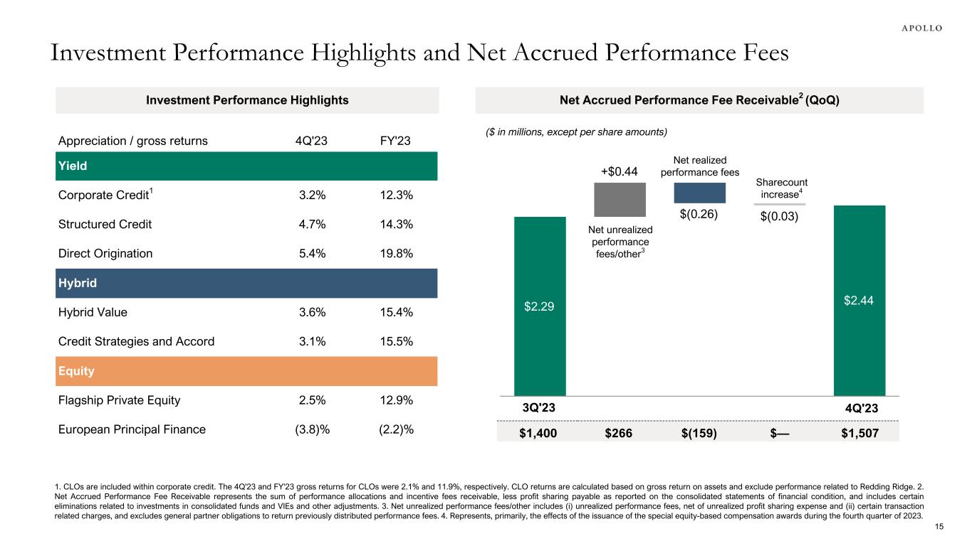 $73 $46 $82 Yield Hybrid Equity • Performance Fee-Eligible AUM of $202 billion increased 12% year-over-year primarily due to third-party Asset Management fundraising • Performance Fee-Generating AUM of $128 billion increased 36% year-over-year due to positive investment performance in Equity, Hybrid and Yield strategies • Dry powder was $58 billion as of year-end, including $46 billion of dry powder with future management fee potential Performance Fee-Eligible AUM ($bn) Performance Fee-Generating AUM ($bn) Dry Powder ($bn) $58 $25 $45 Yield Hybrid Equity $16 $13 $29 Yield Hybrid Equity $58bn$128bn$202bn Note: AUM and Dry Powder totals may not add due to rounding. Dry Powder includes capital available for investment included within performance fee-eligible AUM as well as capital available for investment which does not earn any performance fees. Performance Fee AUM and Dry Powder 14