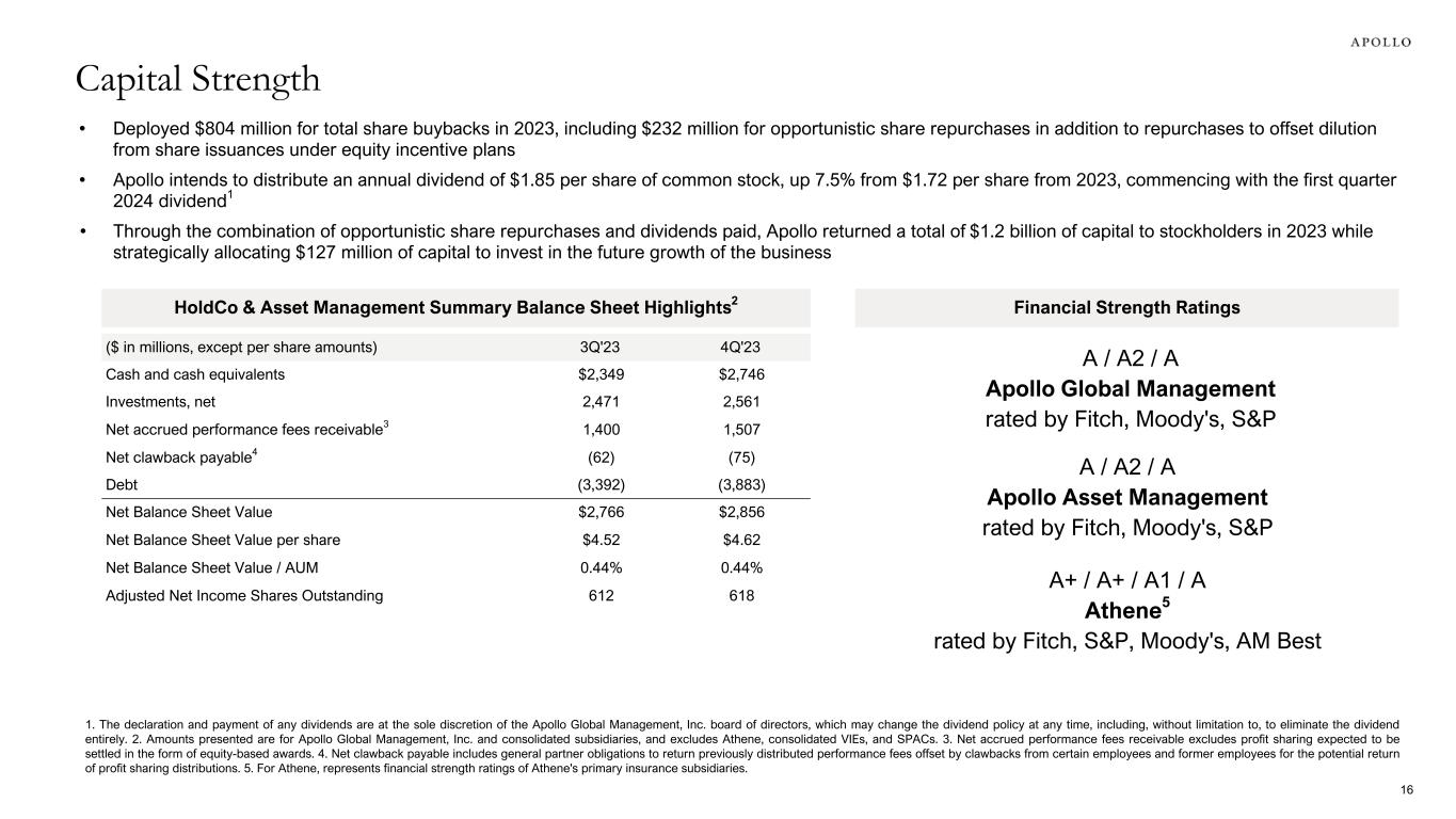 Investment Performance Highlights Net Accrued Performance Fee Receivable2 (QoQ) Appreciation / gross returns 4Q'23 FY'23 Yield Corporate Credit1 3.2% 12.3% Structured Credit 4.7% 14.3% Direct Origination 5.4% 19.8% Hybrid Hybrid Value 3.6% 15.4% Credit Strategies and Accord 3.1% 15.5% Equity Flagship Private Equity 2.5% 12.9% European Principal Finance (3.8)% (2.2)% $2.29 +$0.44 $(0.26) $(0.03) $2.44 Net unrealized performance fees/other3 3Q'23 Net realized performance fees 1. CLOs are included within corporate credit. The 4Q'23 and FY'23 gross returns for CLOs were 2.1% and 11.9%, respectively. CLO returns are calculated based on gross return on assets and exclude performance related to Redding Ridge. 2. Net Accrued Performance Fee Receivable represents the sum of performance allocations and incentive fees receivable, less profit sharing payable as reported on the consolidated statements of financial condition, and includes certain eliminations related to investments in consolidated funds and VIEs and other adjustments. 3. Net unrealized performance fees/other includes (i) unrealized performance fees, net of unrealized profit sharing expense and (ii) certain transaction related charges, and excludes general partner obligations to return previously distributed performance fees. 4. Represents, primarily, the effects of the issuance of the special equity-based compensation awards during the fourth quarter of 2023. 4Q'23 $1,400 $266 $(159) $— $1,507 ($ in millions, except per share amounts) Investment Performance Highlights and Net Accrued Performance Fees 15 Sharecount increase4