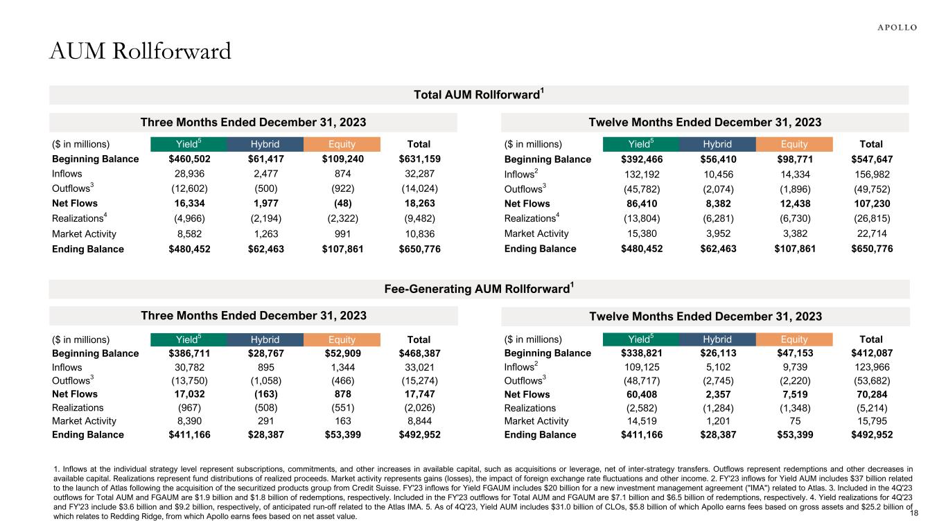 ($ in millions) Yield5 Hybrid Equity Total Beginning Balance $460,502 $61,417 $109,240 $631,159 Inflows 28,936 2,477 874 32,287 Outflows3 (12,602) (500) (922) (14,024) Net Flows 16,334 1,977 (48) 18,263 Realizations4 (4,966) (2,194) (2,322) (9,482) Market Activity 8,582 1,263 991 10,836 Ending Balance $480,452 $62,463 $107,861 $650,776 Three Months Ended December 31, 2023 ($ in millions) Yield5 Hybrid Equity Total Beginning Balance $392,466 $56,410 $98,771 $547,647 Inflows2 132,192 10,456 14,334 156,982 Outflows3 (45,782) (2,074) (1,896) (49,752) Net Flows 86,410 8,382 12,438 107,230 Realizations4 (13,804) (6,281) (6,730) (26,815) Market Activity 15,380 3,952 3,382 22,714 Ending Balance $480,452 $62,463 $107,861 $650,776 Twelve Months Ended December 31, 2023 ($ in millions) Yield5 Hybrid Equity Total Beginning Balance $386,711 $28,767 $52,909 $468,387 Inflows 30,782 895 1,344 33,021 Outflows3 (13,750) (1,058) (466) (15,274) Net Flows 17,032 (163) 878 17,747 Realizations (967) (508) (551) (2,026) Market Activity 8,390 291 163 8,844 Ending Balance $411,166 $28,387 $53,399 $492,952 Three Months Ended December 31, 2023 ($ in millions) Yield5 Hybrid Equity Total Beginning Balance $338,821 $26,113 $47,153 $412,087 Inflows2 109,125 5,102 9,739 123,966 Outflows3 (48,717) (2,745) (2,220) (53,682) Net Flows 60,408 2,357 7,519 70,284 Realizations (2,582) (1,284) (1,348) (5,214) Market Activity 14,519 1,201 75 15,795 Ending Balance $411,166 $28,387 $53,399 $492,952 Twelve Months Ended December 31, 2023 Fee-Generating AUM Rollforward1 Total AUM Rollforward1 1. Inflows at the individual strategy level represent subscriptions, commitments, and other increases in available capital, such as acquisitions or leverage, net of inter-strategy transfers. Outflows represent redemptions and other decreases in available capital. Realizations represent fund distributions of realized proceeds. Market activity represents gains (losses), the impact of foreign exchange rate fluctuations and other income. 2. FY'23 inflows for Yield AUM includes $37 billion related to the launch of Atlas following the acquisition of the securitized products group from Credit Suisse. FY'23 inflows for Yield FGAUM includes $20 billion for a new investment management agreement ("IMA") related to Atlas. 3. Included in the 4Q'23 outflows for Total AUM and FGAUM are $1.9 billion and $1.8 billion of redemptions, respectively. Included in the FY'23 outflows for Total AUM and FGAUM are $7.1 billion and $6.5 billion of redemptions, respectively. 4. Yield realizations for 4Q'23 and FY'23 include $3.6 billion and $9.2 billion, respectively, of anticipated run-off related to the Atlas IMA. 5. As of 4Q'23, Yield AUM includes $31.0 billion of CLOs, $5.8 billion of which Apollo earns fees based on gross assets and $25.2 billion of which relates to Redding Ridge, from which Apollo earns fees based on net asset value. AUM Rollforward 18
